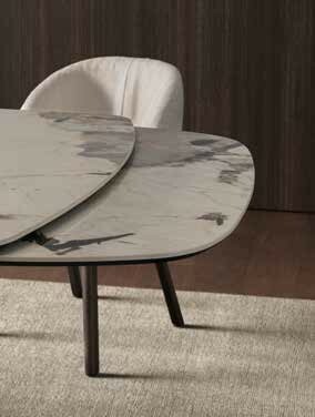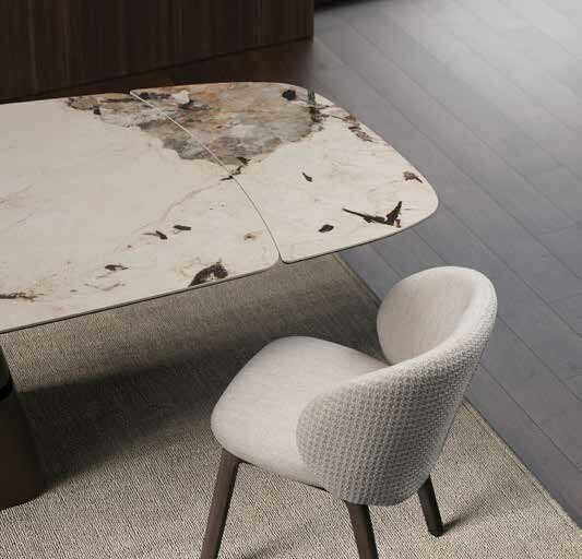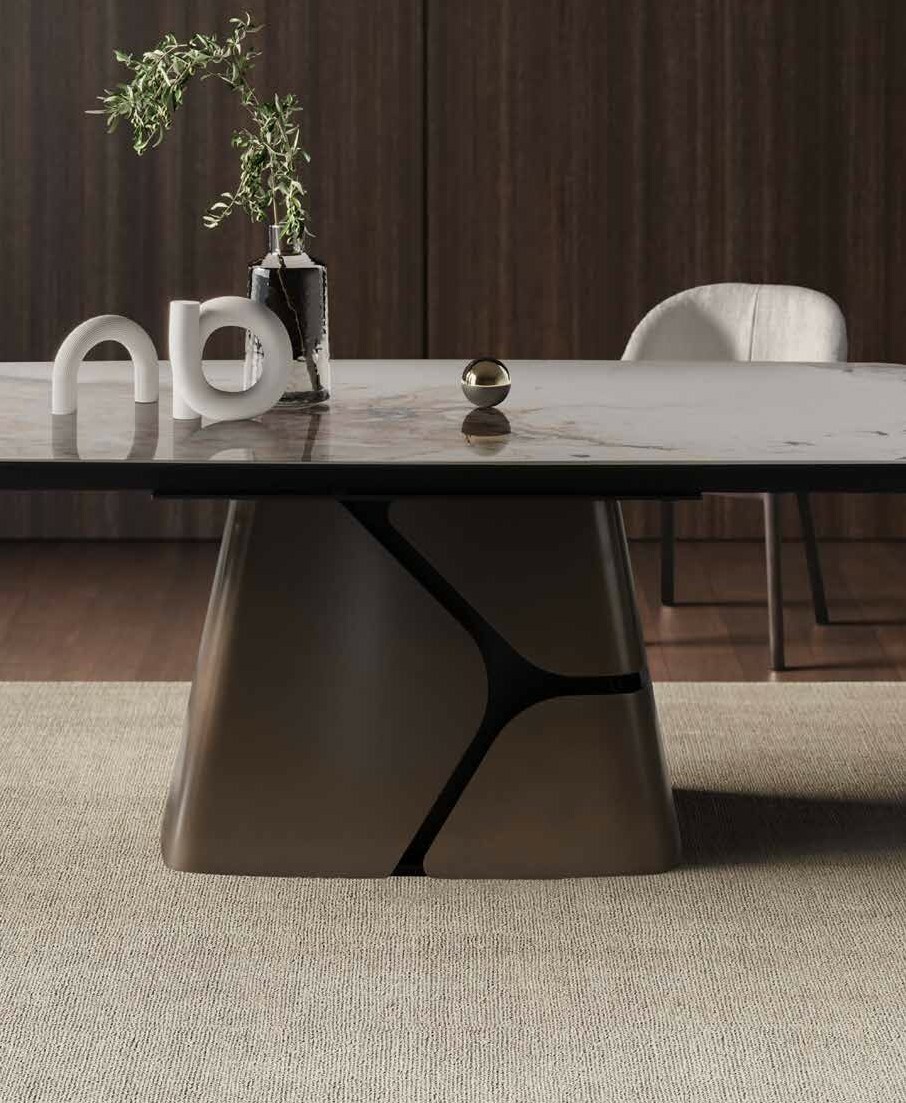Своей формой и монументальностью основание стола напоминает древнюю крепость, сложенную из гладких валунов. Итальянские дизайнеры переосмыслили этот архитектурный посыл, выполнив его из металла с матовым покрытием. Массивное основание приобретает лёгкость благодаря эффекту сквозного просвечивания, что придаёт непринуждённое изящество всей конструкции.