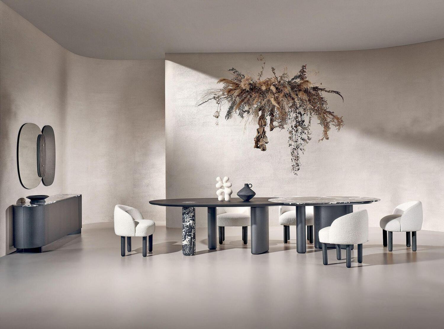 Плавные и органические очертания стола Lymph создают образы природных элементов и дарят ощущение текучего потока, привнося естественную гармонию в интерьер. Разнообразие отделок деревянного основания: металлическими элементами или мраморными вставками создает визуальную параллель со столешницей из мрамора, дерева или керамики и подчёркивает художественно-декоративный потенциал этого стола. Игра материалов между основанием и столешницей делает каждый вариант дизайна уникальным и неповторимым, идеально вписывающимся в любой интерьер.