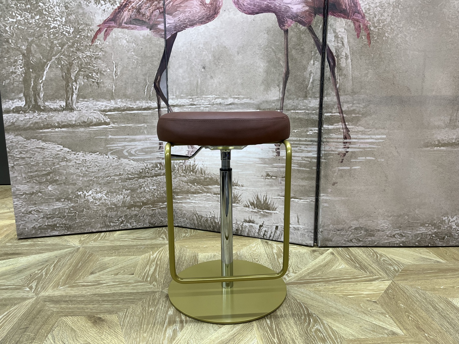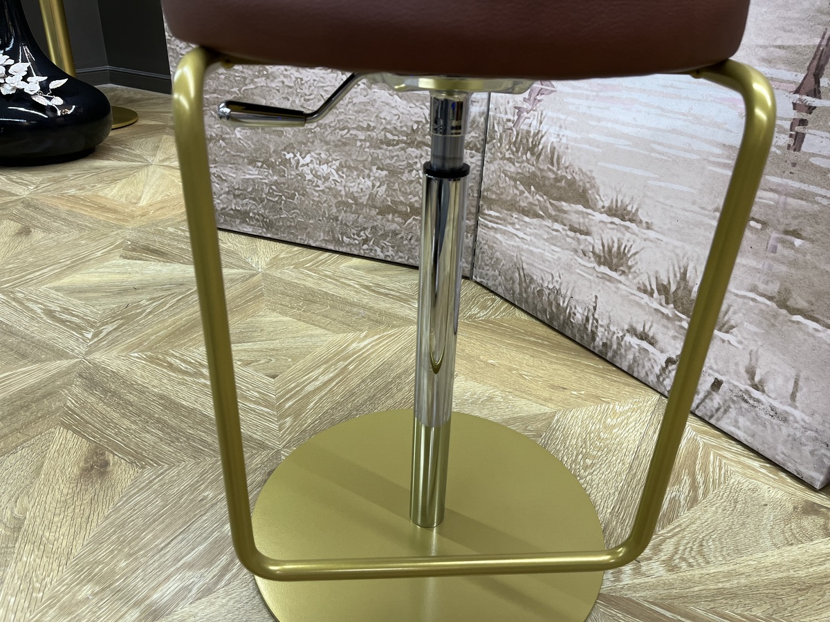 Сиденье изготовлено из мебельный фанеры и обтянуто натуральной кожей с эффектом винтаж. Стальное поворотное основание имеет приятный золотой цвет.
