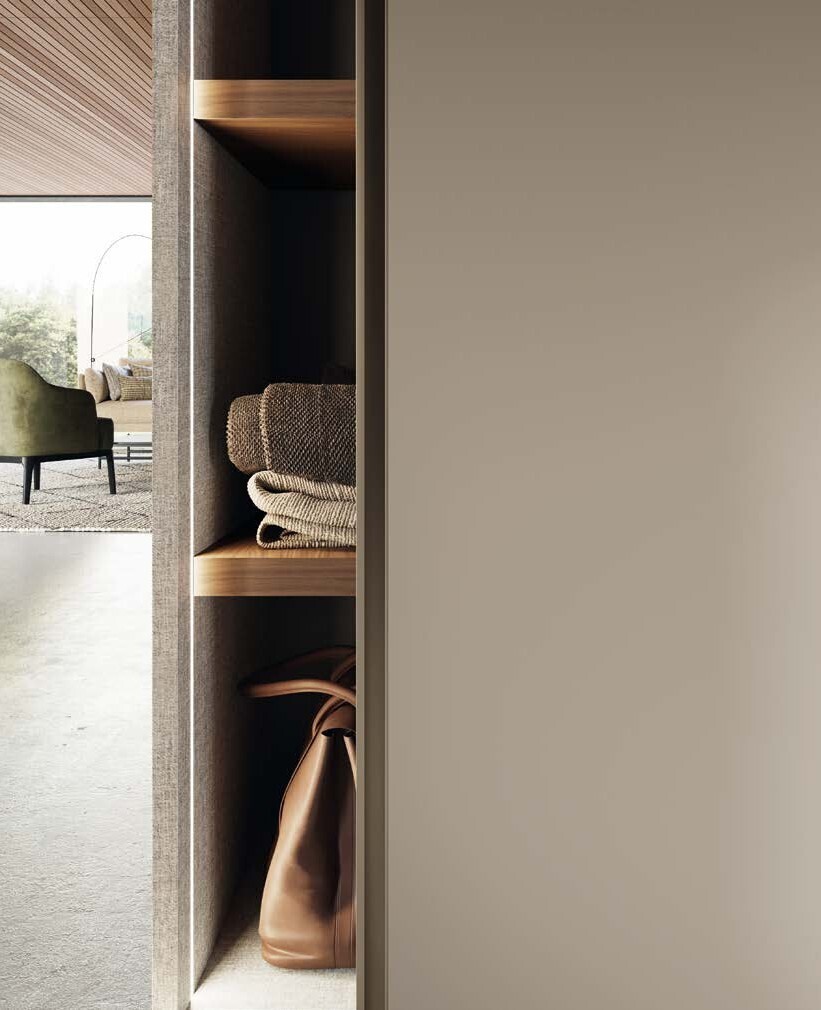 Шкаф NODO имеет простой и линейный дизайн, позволяющий максимально использовать внутренне пространство, а также его наполнение. Встроенные ручки по типу GOLA идут по всей высоте и могут быть в различных отделках. За счет них силуэт шкафа визуально вытягивается вверх.