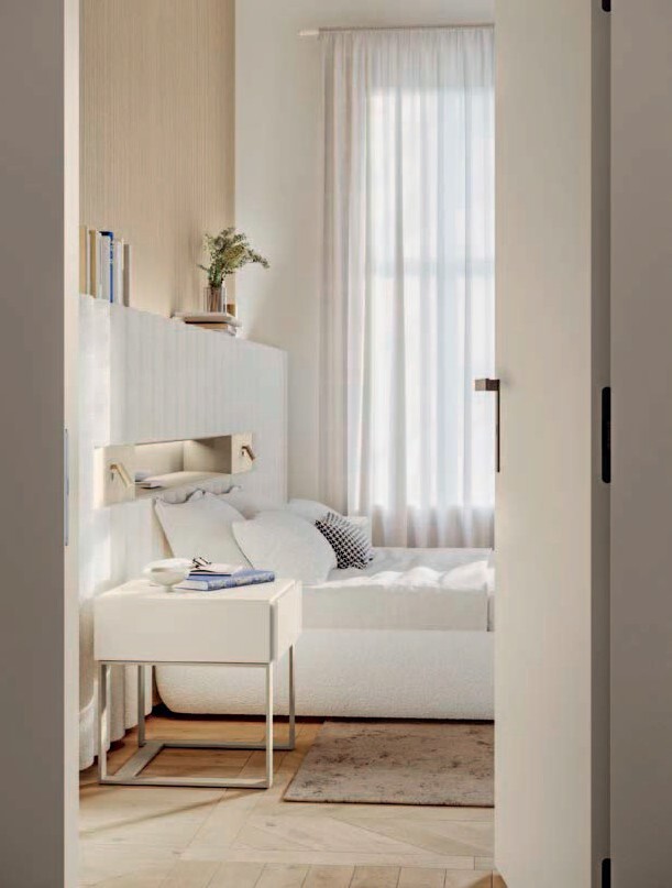 Кровать Dress Code H. 130 в ткани Grain Bianco и горизонтальном блоке с металлическим лаком Champagne со светодиодной подсветкой становится обителью для крепких и сладких снов. К ней превосходно подходит ночной блок Aqua в цвете Lino 10:10 с основанием цвета шампань.