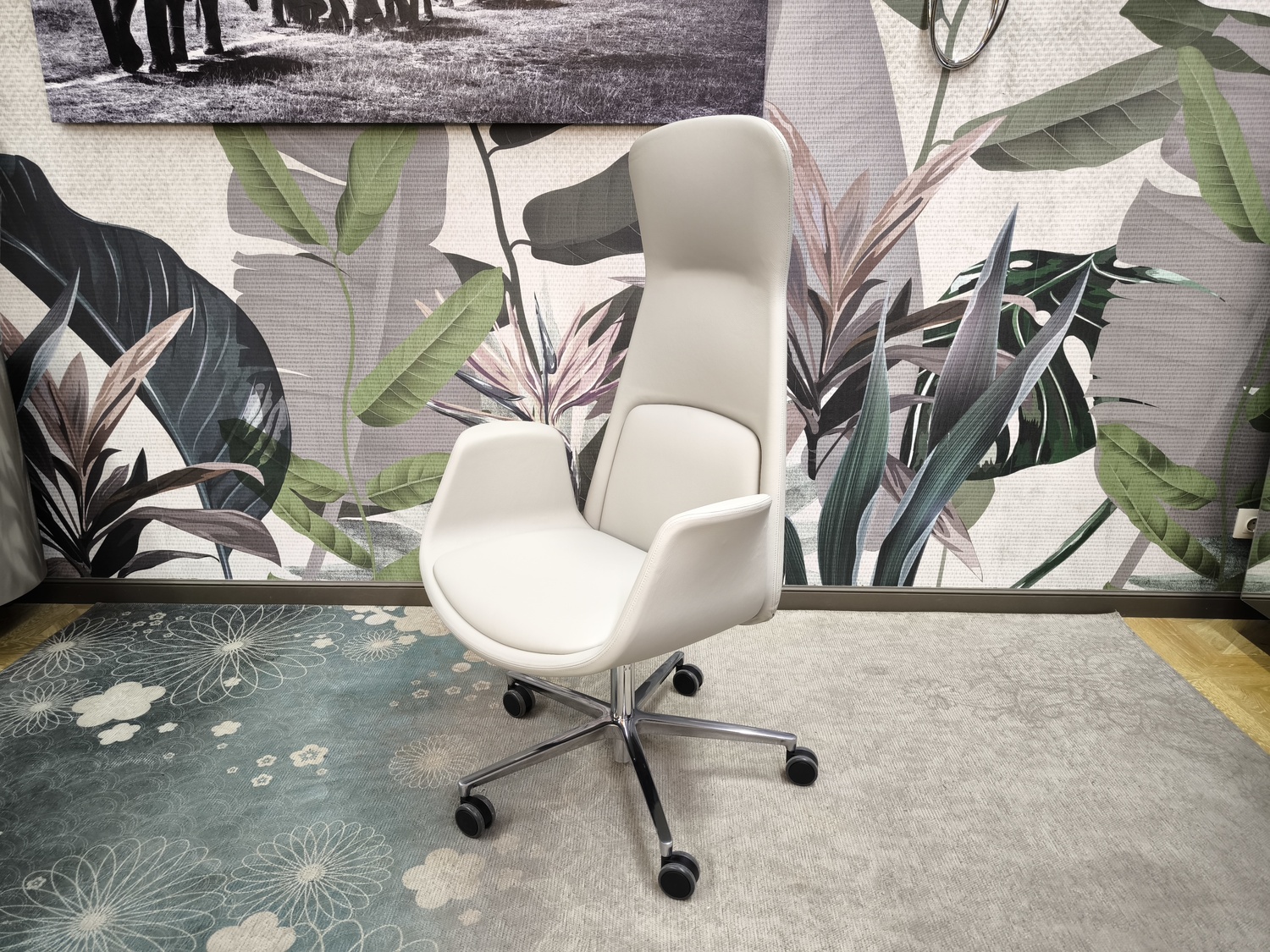 Элегантное офисное кресло из натуральной кожи с лаконичным дизайном и высокой спинкой. Эргономичные формы и линии, заимствованные из автомобильного дизайна для универсального кресла для домашнего кабинета или рабочего офиса.