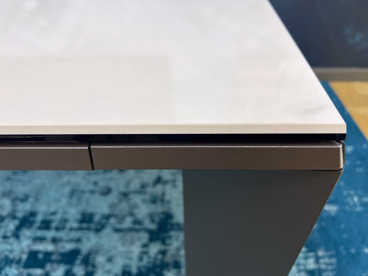 Стол уникален тем, что вставка изготовлена также из керамогранита и хранится внутри стола. Встроенные в ноги колесики позволяют легко раздвинуть основание стола, а специальный механизм выдвигает и поднимает вставку для того, чтобы установить ее на один уровень со столешницей.