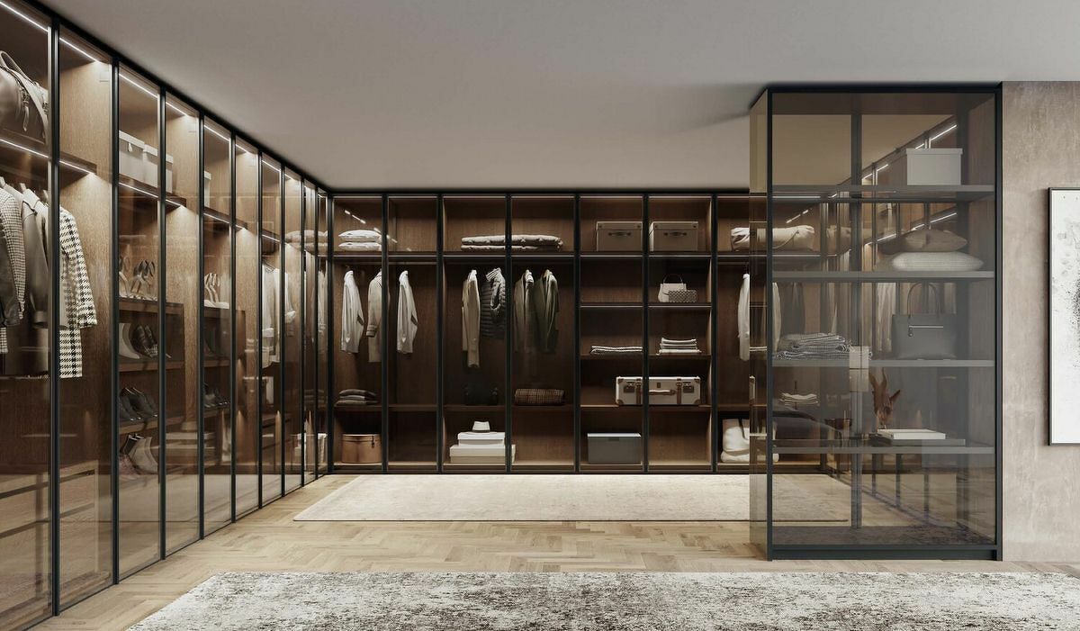 Стеклянный фасад превращает шкаф в настоящую витрину и может быть в различных вариантах: распашной, раздвижной или складной. Утонченность и изысканность шкафу придает интегрированная ручка и строгость вертикальных линий алюминиевой рамы фасада.
