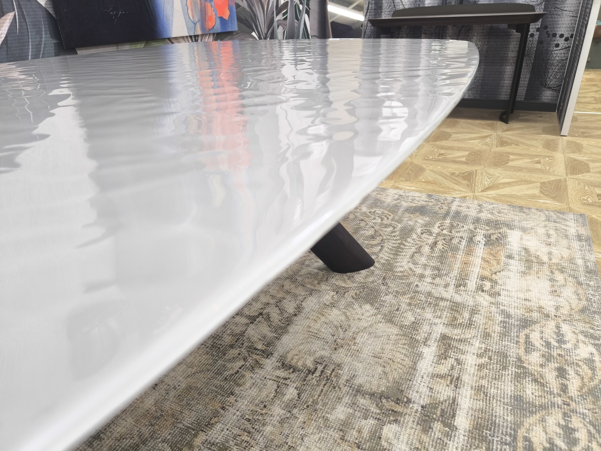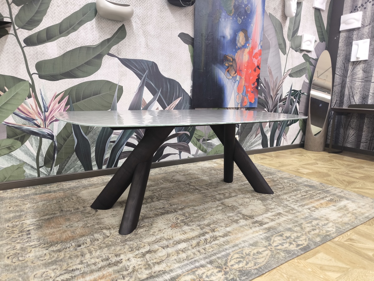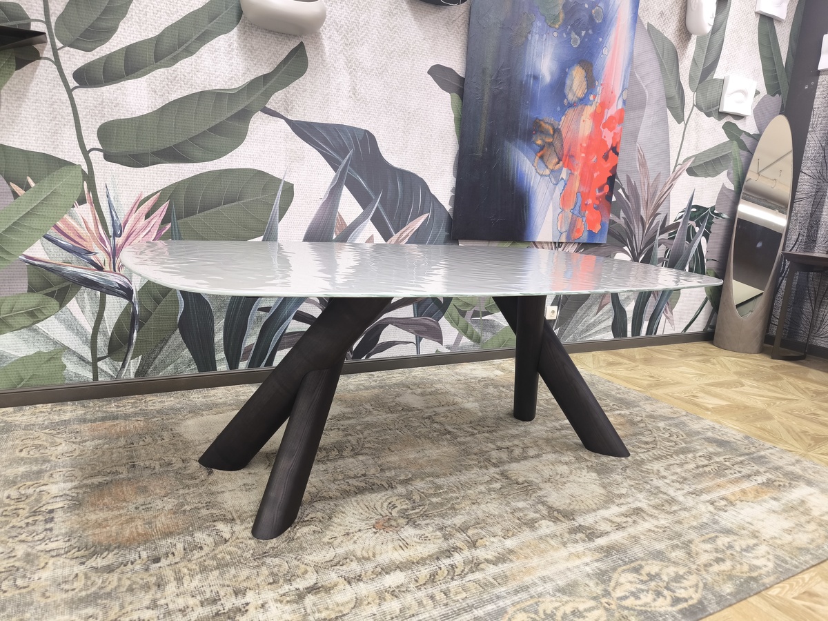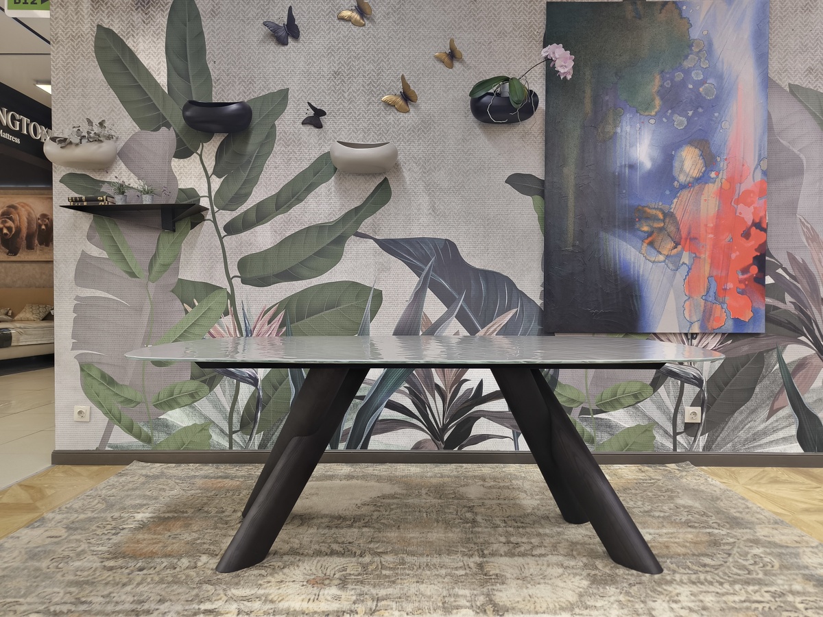 Стол является отражением баланса солидности конструкции и визуальной легкости. Дизайнерская особенность стола заключается в рустикальном основании, изготовленном из массива дерева в виде скульптурных и динамичных пересечений, создающим при этом игру объемов и наклонных линий.