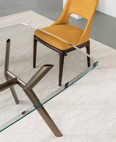 Стол со столешницей из закаленного стекла толщиной 12/15 мм. Стол может также иметь круглую столешницу с многогранным фацетом Diamantato.