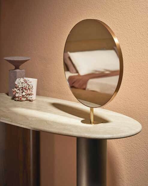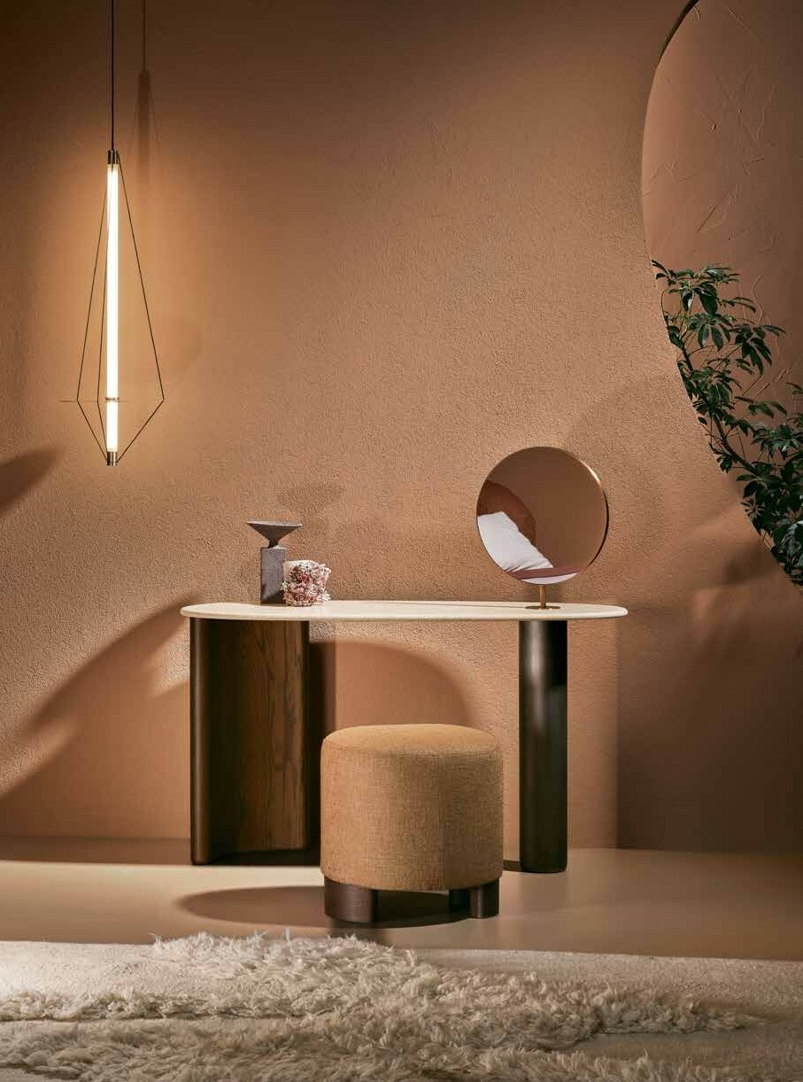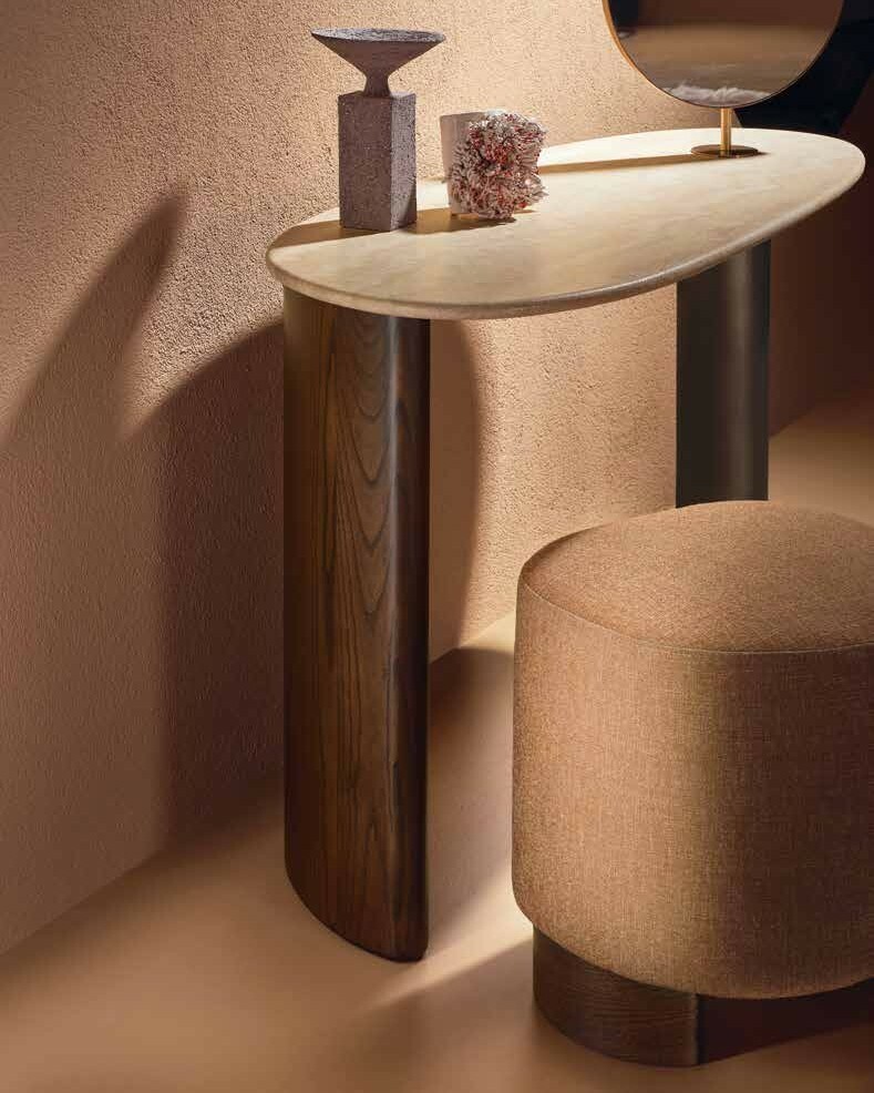 Туалетный столик Lymph Beauty — симфония органичности и мастерства. Он, словно грациозная балерина на сцене, завораживает плавностью и утончённой элегантностью. Столешница из благородного травертинового мрамора органичной, свободной формы — настоящий шедевр природной роскоши, где узор прожилок рассказывает свою уникальную историю. Основание из ясеня цвета грецкого ореха подсвечено блеском латунного зеркала, играющего роль сияющего солнца и наполняющего пространство тёплым золотистым сиянием. Туалетный столик Lymph Beauty становится душой пространства, ежедневно даря частичку искусства и воплощая мечту об изысканной жизни в каждом своём изгибе.