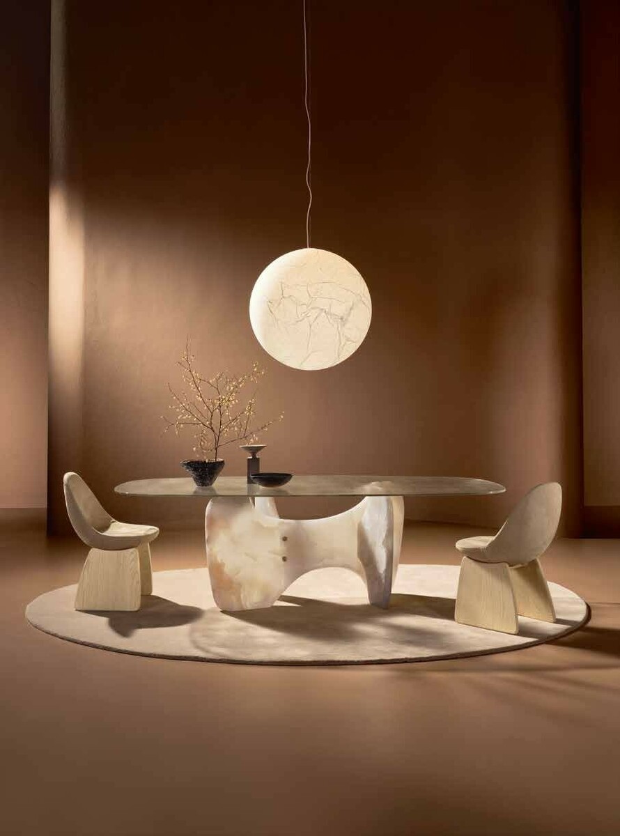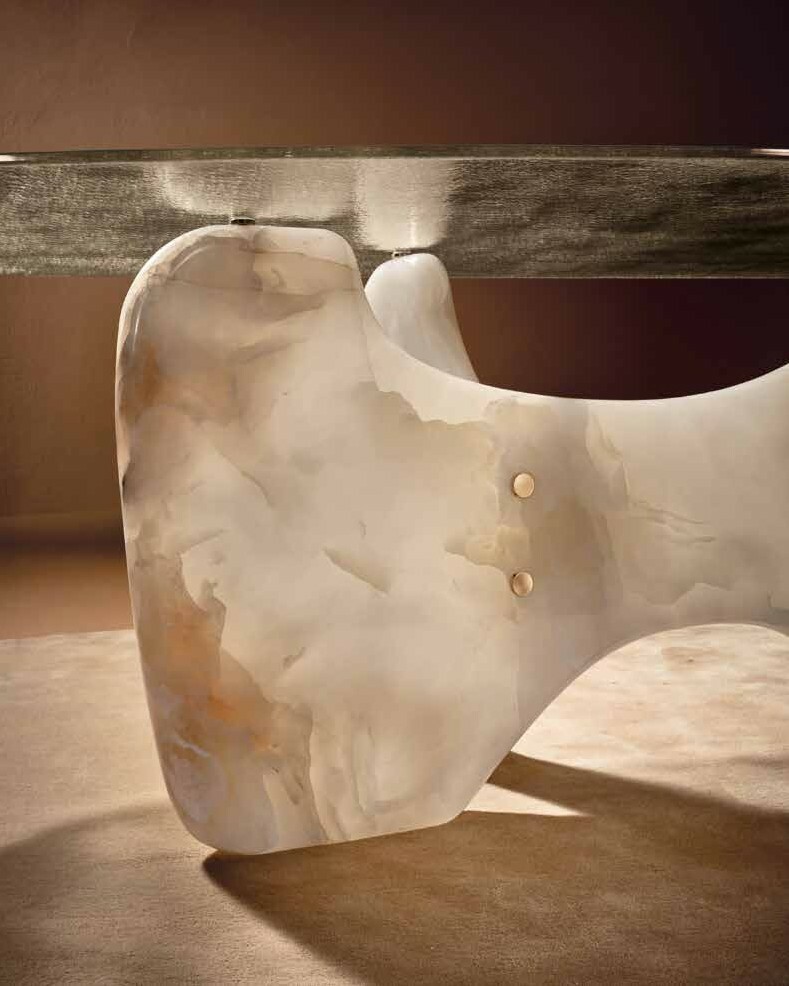 Tribe Onyx всегда был больше, чем стол. В новой интерпретации он становится ещё глубже, ещё притягательнее. Скульптурное основание с рельефными формами теперь выполнено из оникса, одного из самых завораживающих камней на Земле. Тёплые оттенки — золотисто-жёлтый, медовый, янтарно-коричневый — перетекают в глубине камня, словно застывшее пламя. Естественные прожилки, как трещины времени, рассекают его поверхность, придавая каждому экземпляру черты неповторимого характера. Оникс здесь не фон. Он источник света, сердце композиции. Благодаря своей полупрозрачности, стол сияет изнутри. Этот эффект превращает Tribe Onyx в живое произведение искусства, в котором природа и дизайнерская мысль становятся единым целым. Каждый такой стол уникален. Ни одна жилка, ни одна волна в камне не повторяется дважды. Это не серийная мебель. Это индивидуальный голос материала, воплощённый в форме. Это выбор атмосферы, выбор света, который не освещает, а обволакивает.