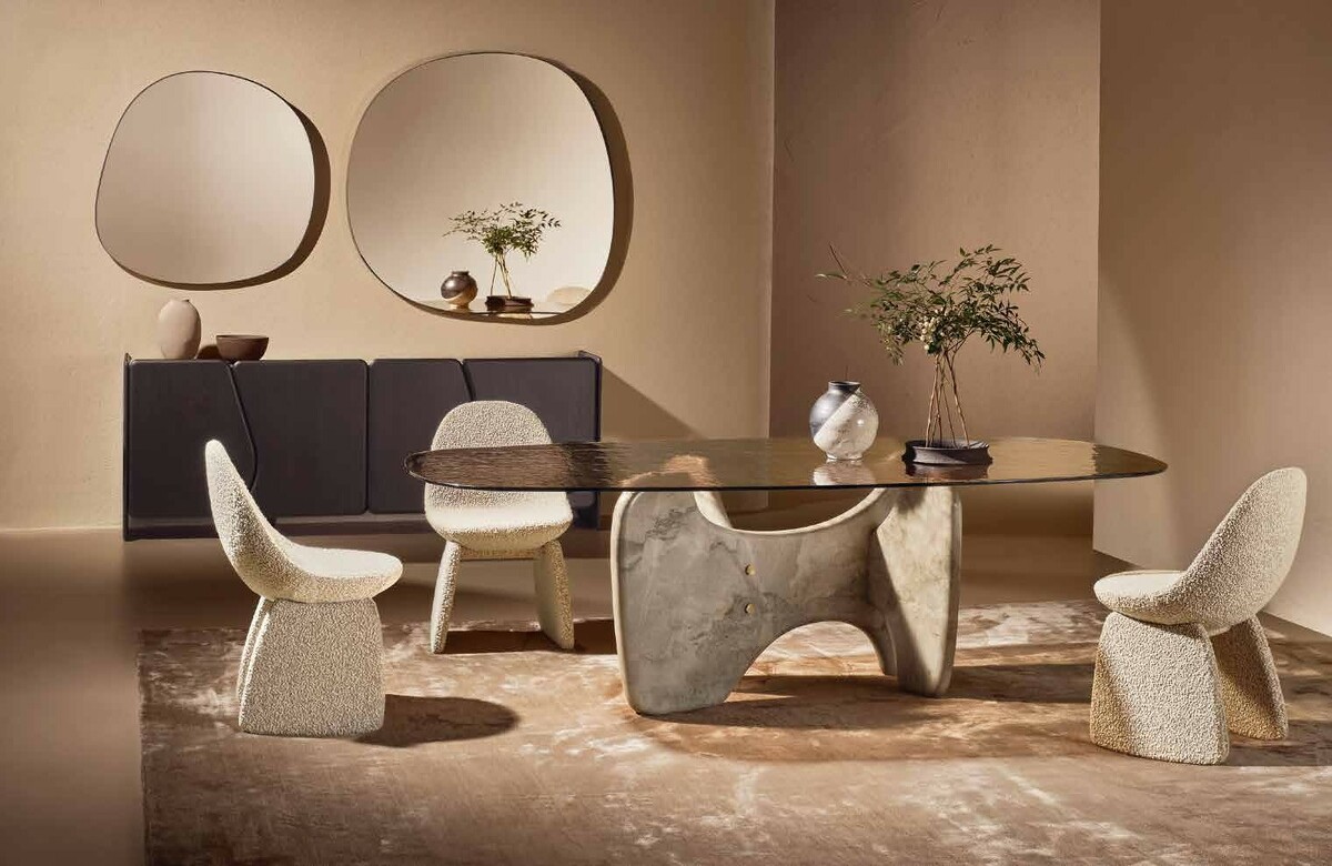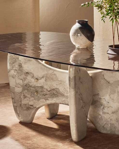 Tribe Stone всегда был больше, чем стол. В новой интерпретации он становится ещё глубже, ещё притягательнее. Скульптурное основание с рельефными формами теперь выполнено из оникса, одного из самых завораживающих камней на Земле. Тёплые оттенки — золотисто-жёлтый, медовый, янтарно-коричневый — перетекают в глубине камня, словно застывшее пламя. Естественные прожилки, как трещины времени, рассекают его поверхность, придавая каждому экземпляру черты неповторимого характера. Оникс здесь не фон. Он источник света, сердце композиции. Благодаря своей полупрозрачности, стол сияет изнутри. Этот эффект превращает Tribe Onyx в живое произведение искусства, в котором природа и дизайнерская мысль становятся единым целым. Каждый такой стол уникален. Ни одна жилка, ни одна волна в камне не повторяется дважды. Это не серийная мебель. Это индивидуальный голос материала, воплощённый в форме. Это выбор атмосферы, выбор света, который не освещает, а обволакивает.