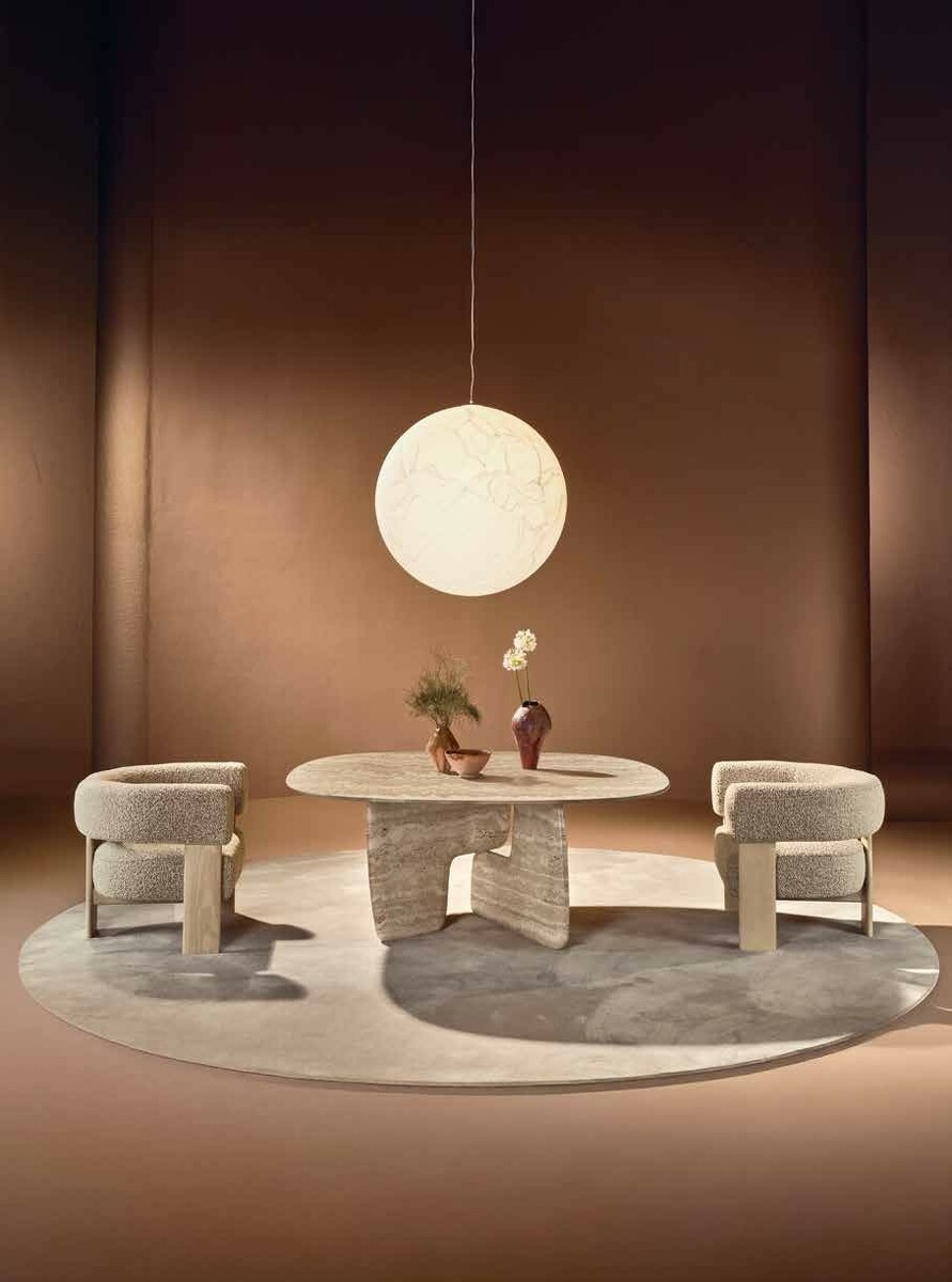 Уменьшенная версия обеденного стола Balance разработана как скульптурный элемент для гостиных и лаунж-зон. Он сохраняет полное подчинение архитектурной идее оригинала, оставаясь в диалоге со светом, тенью и пространством вокруг. Основание состоит из двух симметричных изогнутых модулей, повернутых на 180°. Они пересекаются, дополняя друг друга, и создают калейдоскопическую игру света и тени — как будто застывший танец формы. Стол выполнен целиком из травертинового мрамора, материала, который не кричит о роскоши, а шепчет о ней. Его тёплый песчано-розовый фон с разводами дымчато-серого и охристого цвета напоминает пустынные рассветы, добавляя интерьеру глубины, тепла и природной текстуры. В композиции с тремя креслами Trine Lounge, выполненными из древесины пустынного ясеня и обитыми мягкой тканью букле, возникает пространство, наполненное спокойствием, балансом и естественной элегантностью.