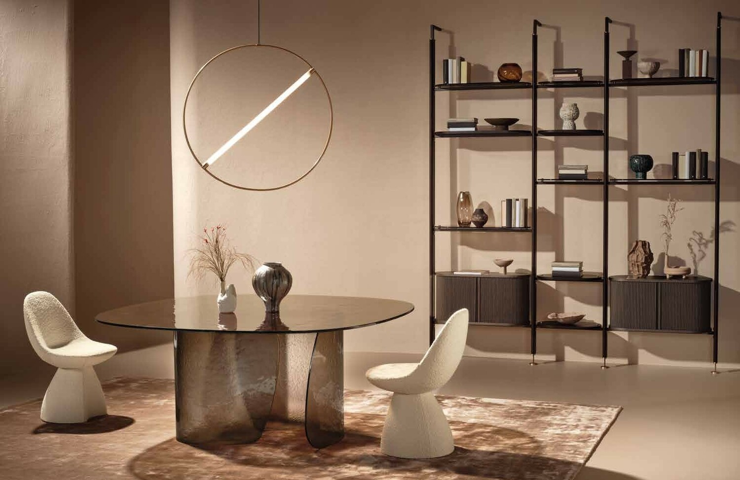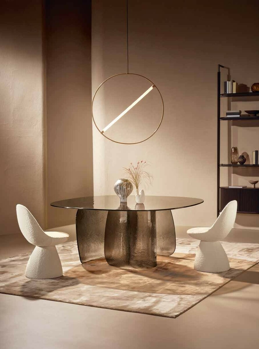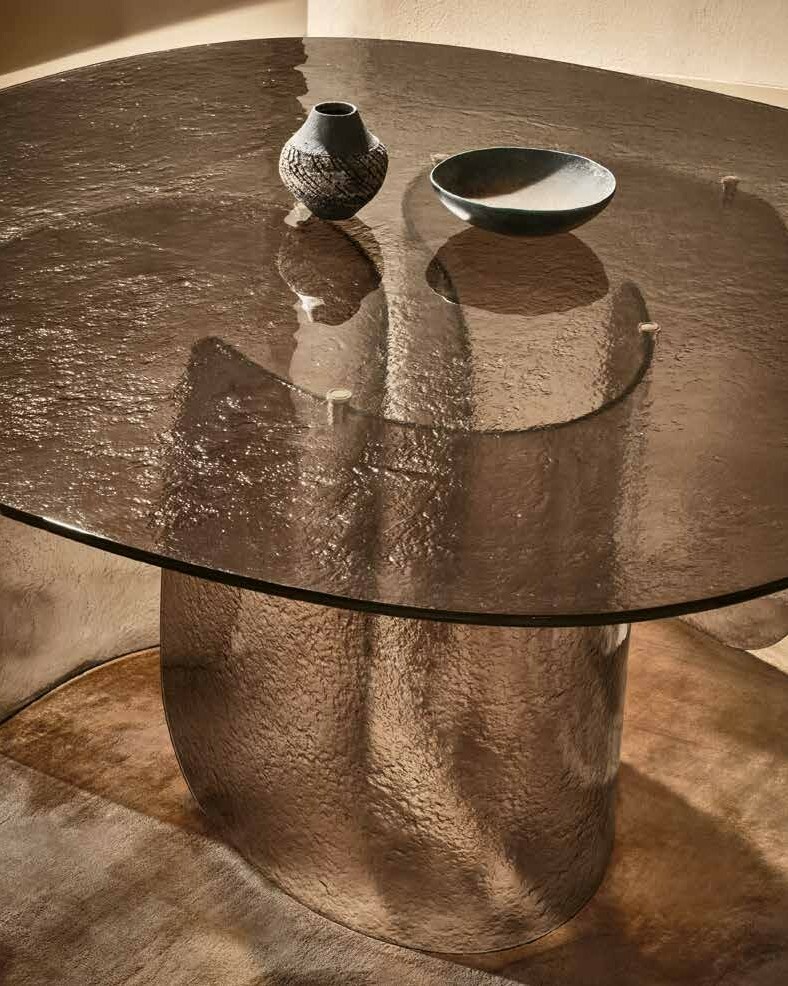 Обновлённая версия классического полностью стеклянного стола Blur от Naturedesign воплощает в себе искусство изменчивости в интерьере. Появление третьего элемента в основании придало рисунку, просвечивающему сквозь столешницу, динамичность и живость при взгляде сверху. Плавные изгибы и обтекаемые очертания Blur рождают магическое ощущение мягкости и текучести, а его лёгкая конструкция поражает своей воздушностью. Текстурированное стекло создаёт завораживающие световые эффекты, воплощая современную философию дизайна, где функциональность органично сочетается с художественным видением, а практичность дополняется эстетическим наслаждением.