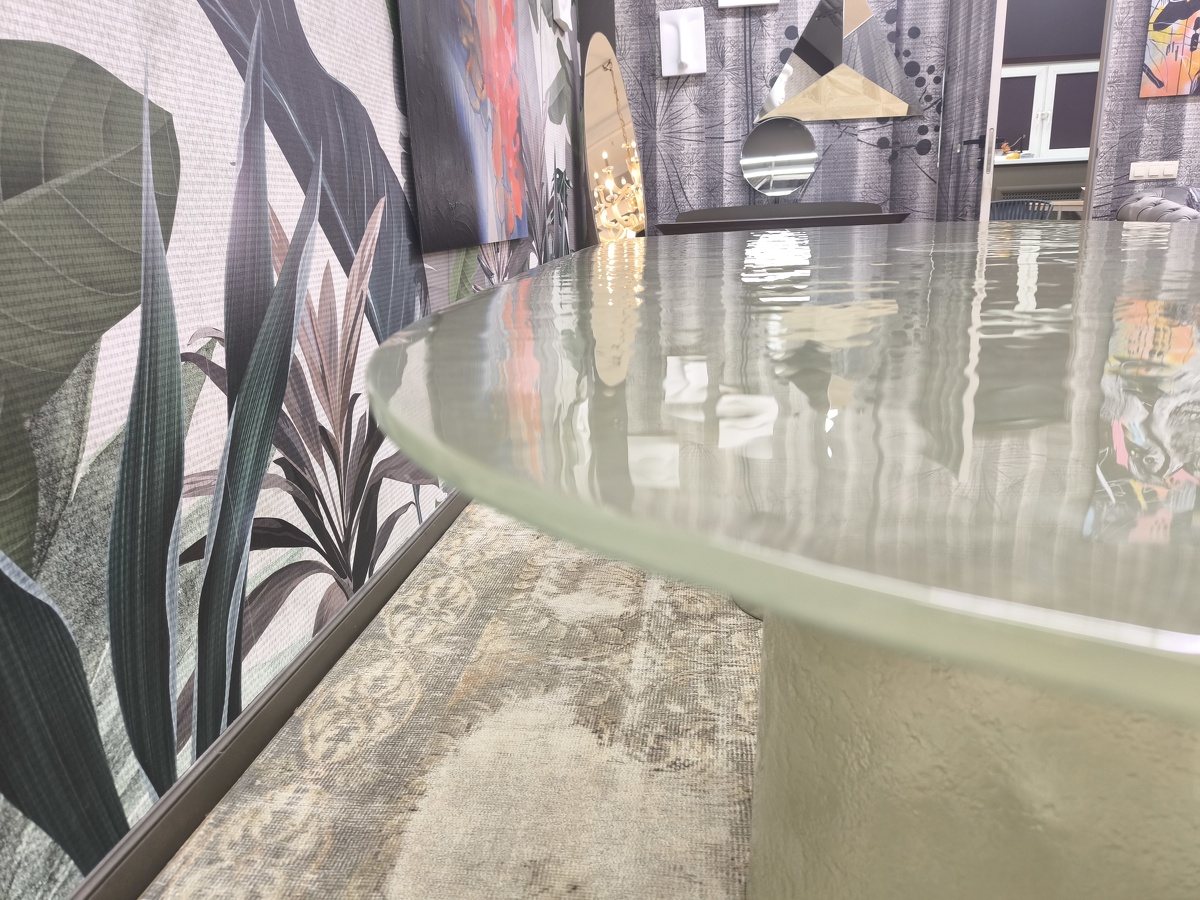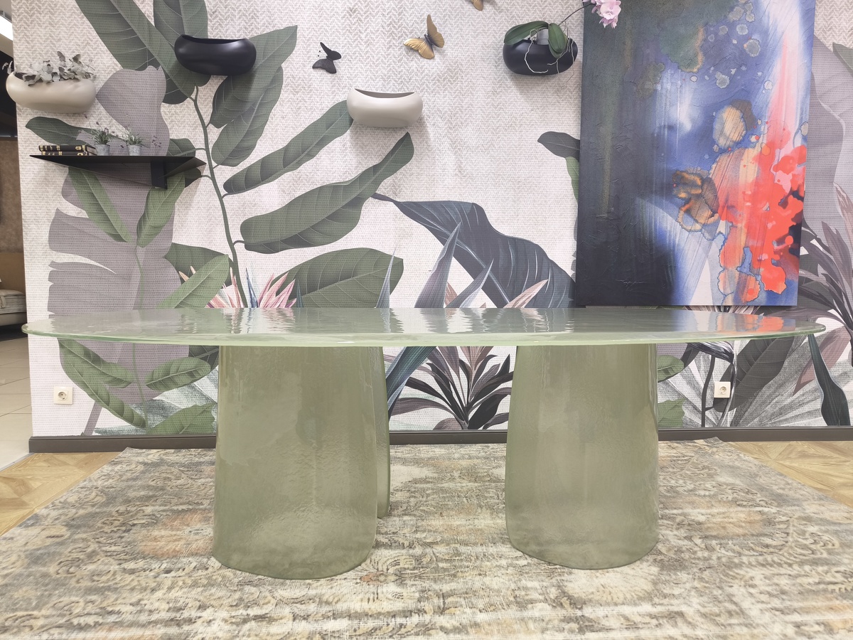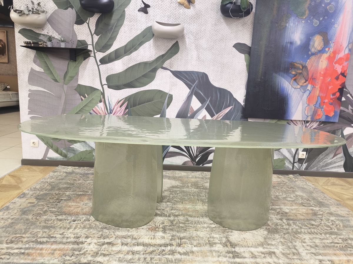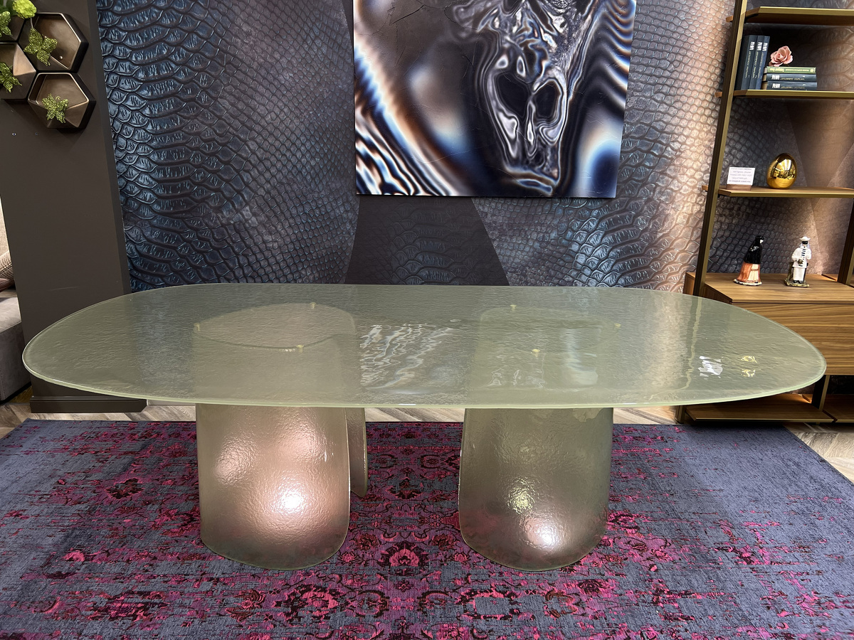 Изысканная грация воплотилась в этом удивительном столе, где стекло становится главным действующим лицом, танцующим в ритме природных изгибов. Cinnamon изготовлен полностью из литого стекла — основание, отлитое с ювелирной точностью, повторяет естественные изгибы коричной палочки, создавая завораживающий скульптурный силуэт. Плавно наклонённая кромка столешницы создает эффект лёгкого приглашения присесть, а её деликатное скругление перекликается с общей текучестью формы. Стол в цвете мятного тумана выглядит как кусочек застывшей прозрачной воды с лёгкой бирюзовой дымкой. Исполненный бронзовом оттенке придаёт пространству глубину и теплоту солнечных бликов. Cinnamon очаровывает с первого взгляда своей чувственной эстетикой, рождая новый стандарт интерьерной роскоши.