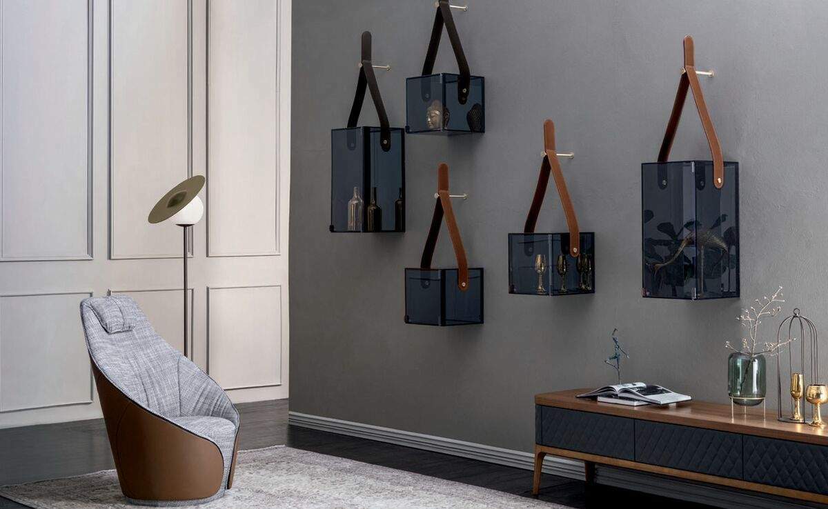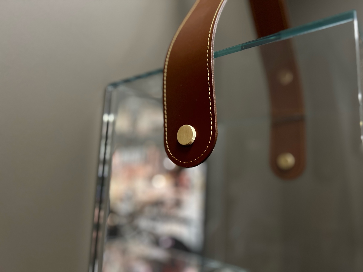 Элегантные стеклянные полки с зеркальной задней стенкой. Изысканное оформление деталями из натуральной кожи.