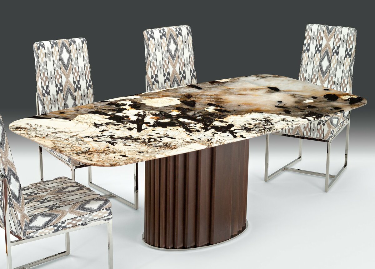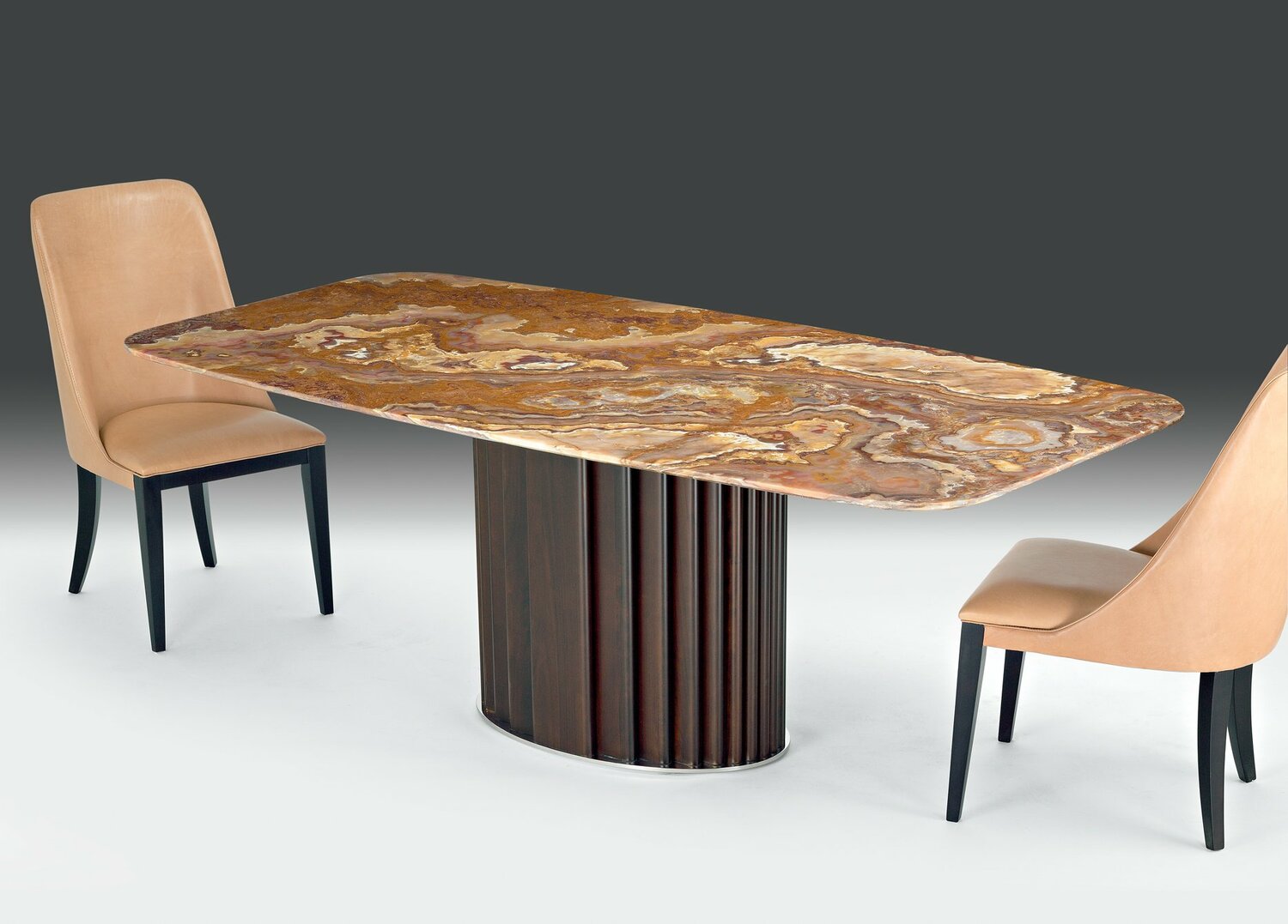 Стол Mayfair - это абсолютно новая модель, представленная в 2025 году. Определяющий элемент в дизайне стола - деревянное скульптурное основание на металлической платформе. Продольный рельефный рисунок элегантно подчеркивает структуру дерева и отражает современные тенденции в дизайне интерьера. Стол будет идеальным дополнением в жилые пространства, также оформленные реечными деревянными панелями. Столешница из натурального мрамора толщиной 2 см имеет закругленную эргономичную форму.