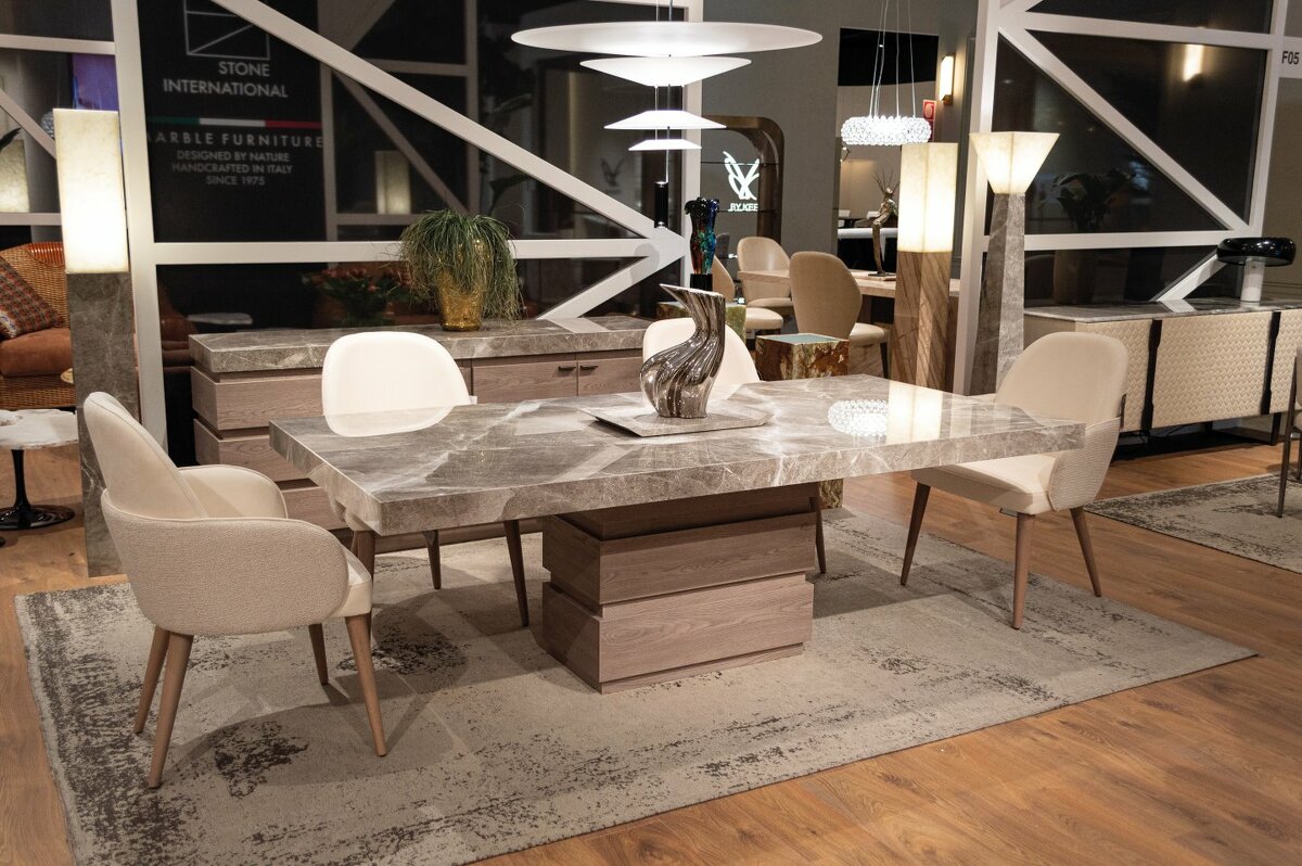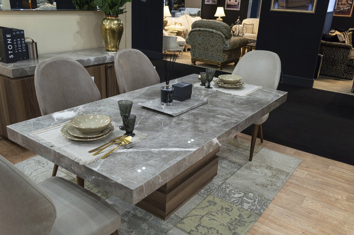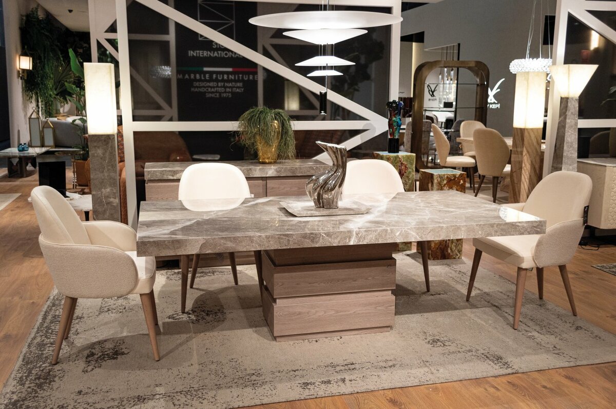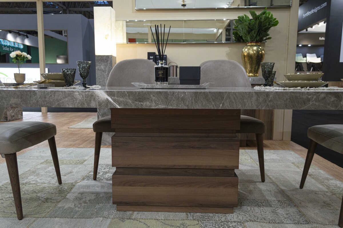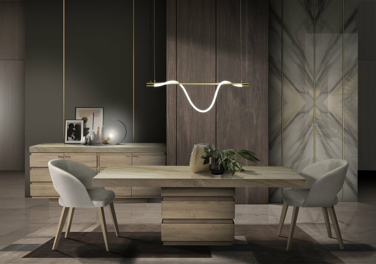 Геометричность силуэтов деревянных элементов изысканно подчеркнута сглаженным фацетом столешниц из натурального мрамора.