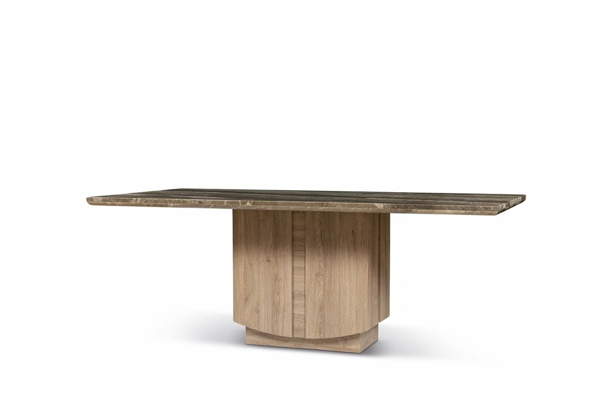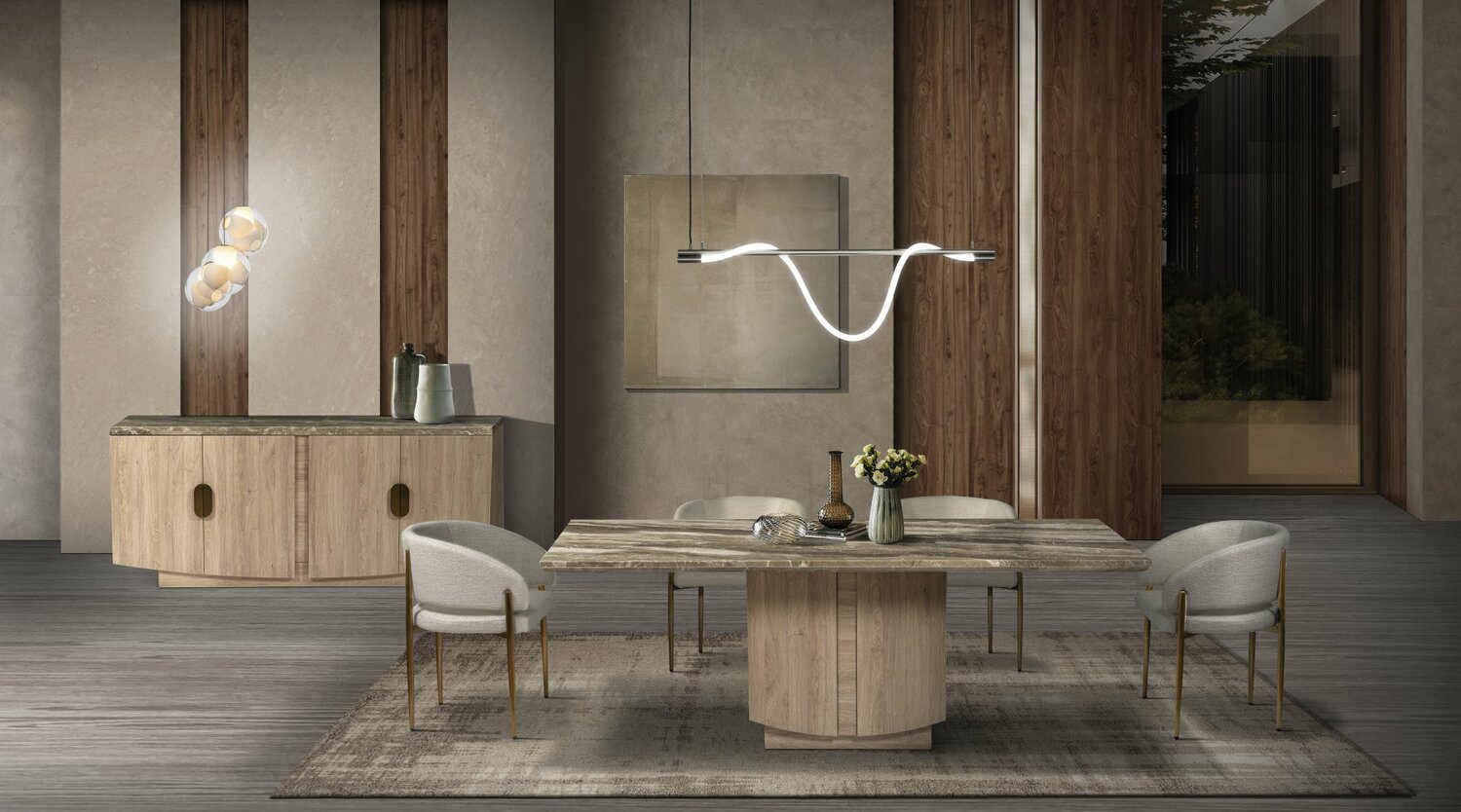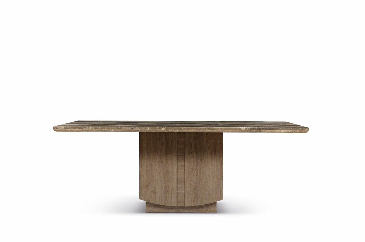 В коллекцию входят обеденные столы, тумбы для гостиной, элементы для спальной зоны. Все предметы выполнены из натурального мрамора и дерева. Геометричные формы смягчены изящными линиями декора и фацетами, оформляющими сбалансированный край на столешнице, изготовленной из натурального мрамора. Дизайн, который предлагает новый взгляд на традиции: солидность и архитектурная монументальность, перерожденная в плавность и элегантность.