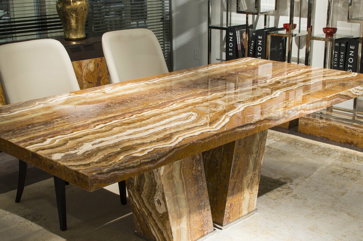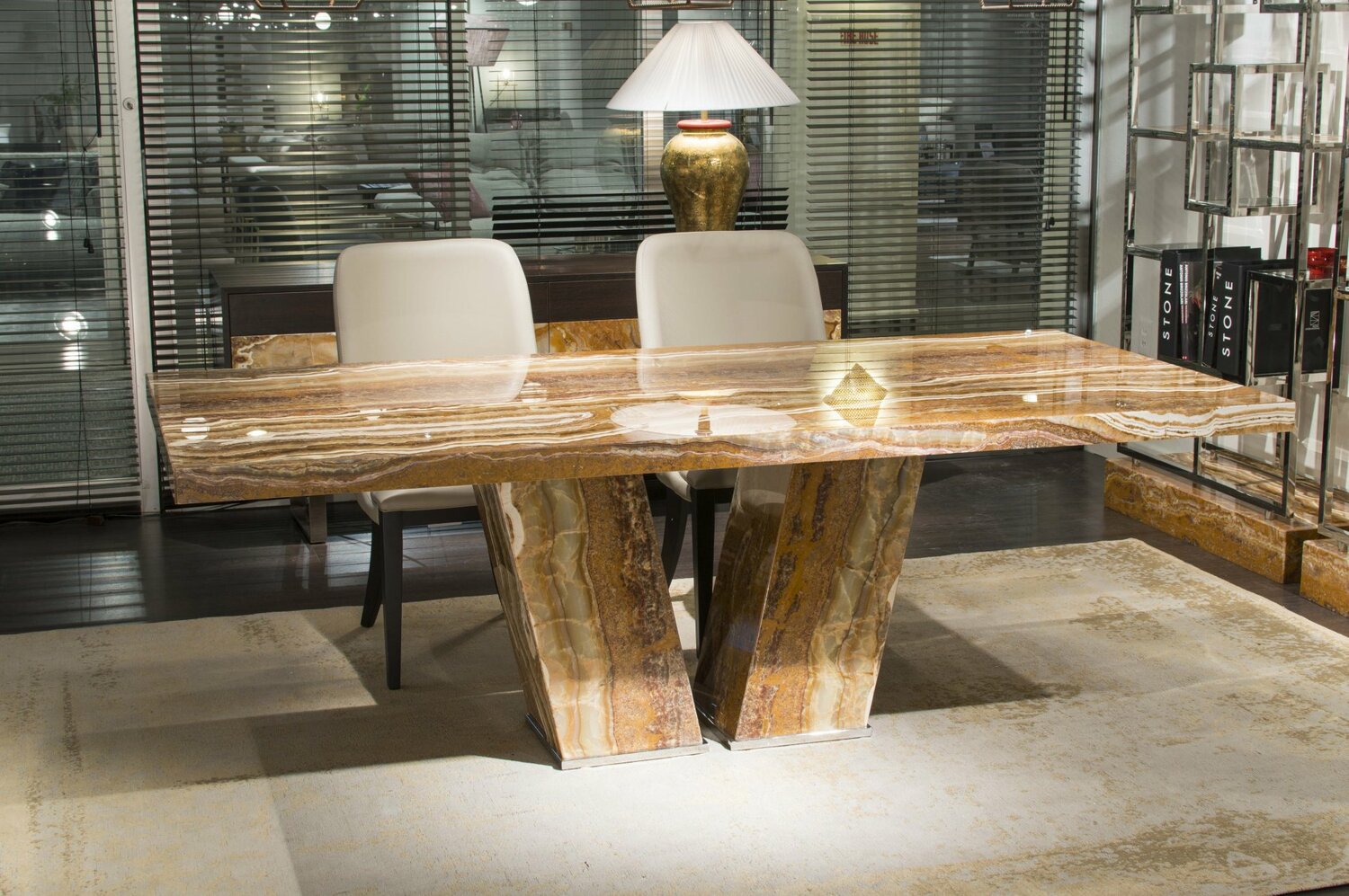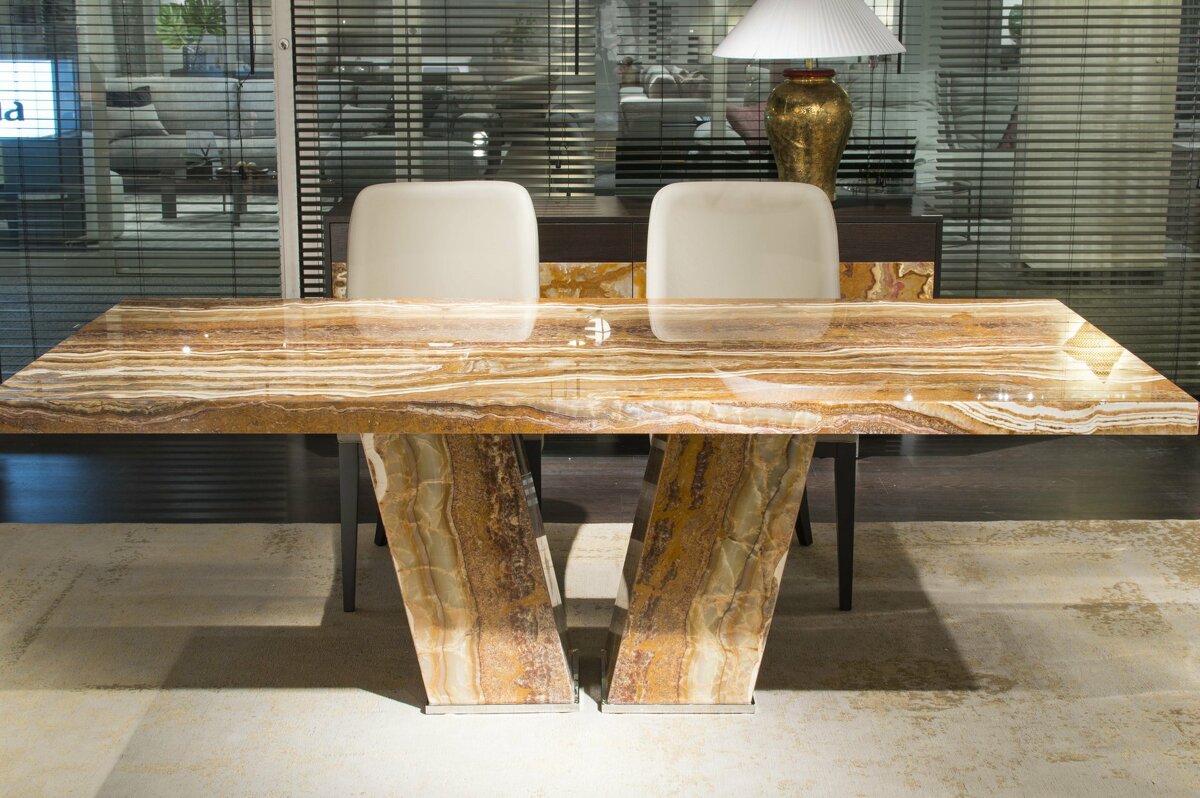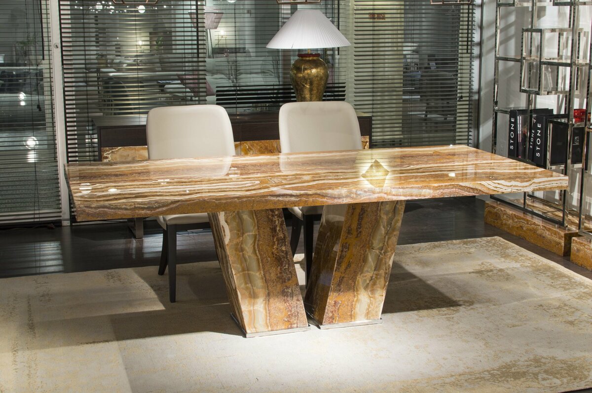 Стол полностью изготовлен из мрамора в любом из 28 представленных природных вариантов . Основание стола украшают декорированные элементы из глянцевой стали.