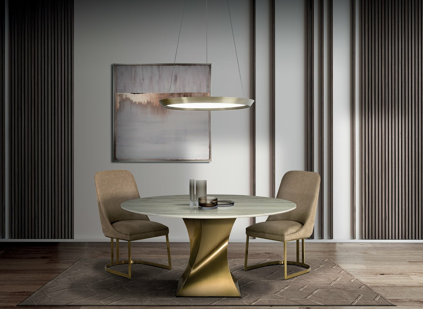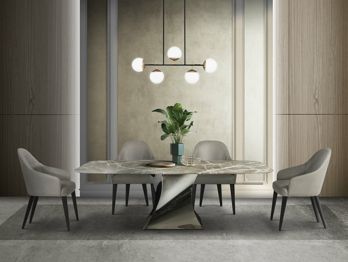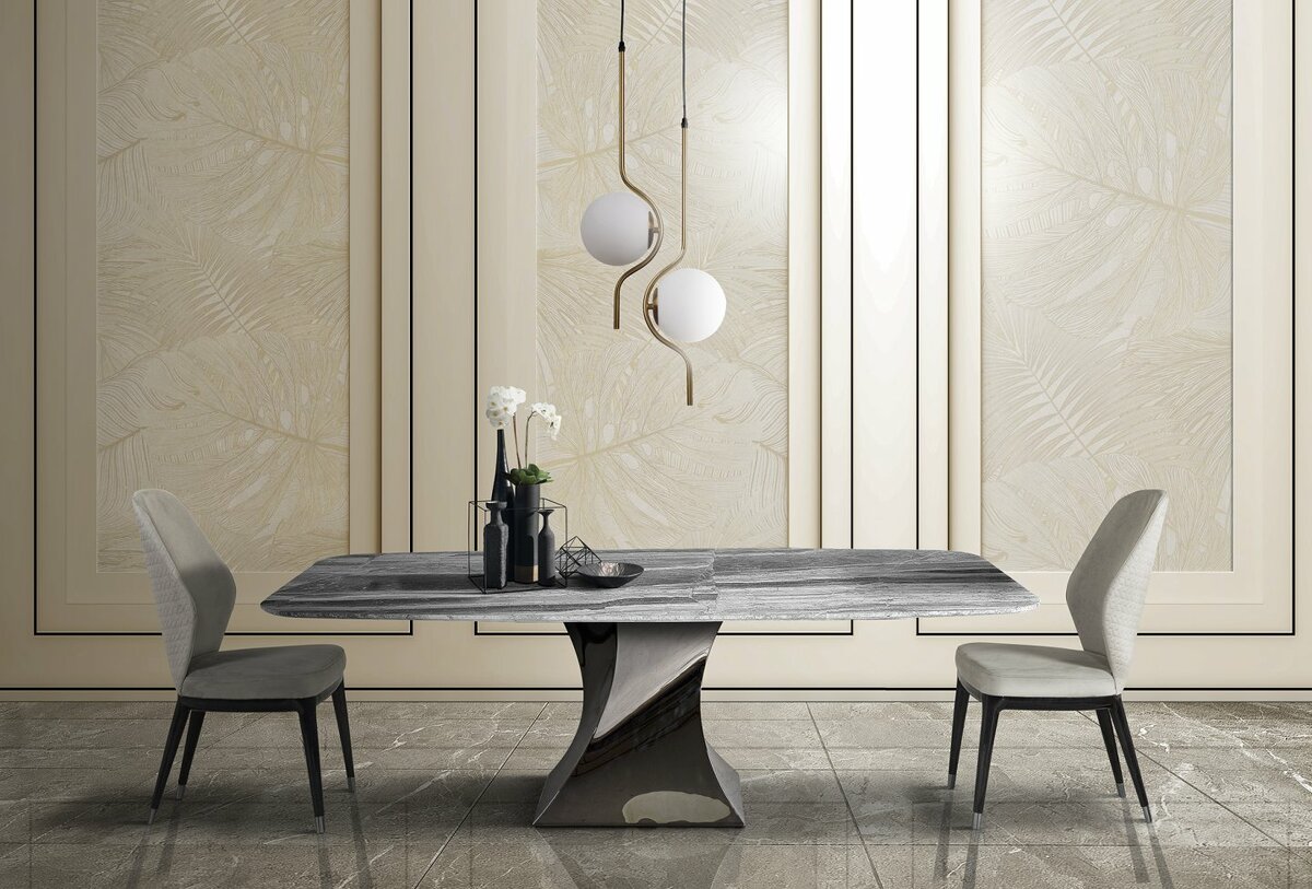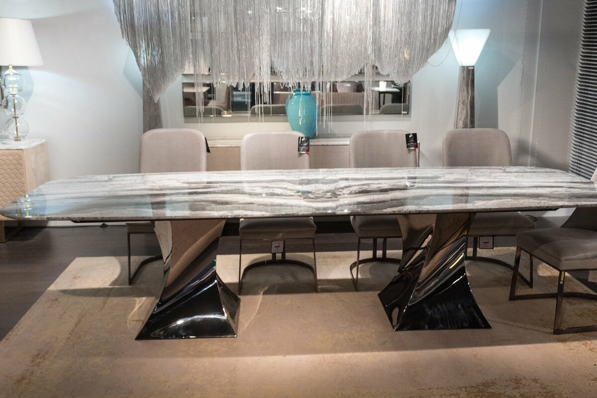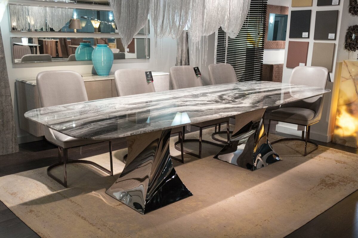 Коллекция обеденных столов TWIST преподнесена как новая тенденция в мире мебельной моды с точки зрения эксклюзивности и элегантности. Великолепные формы металлического основания, которое оборачивается вокруг себя как в волшебном в танце, создают изогнутые поверхности, отражающие свет самым неожиданным образом.
