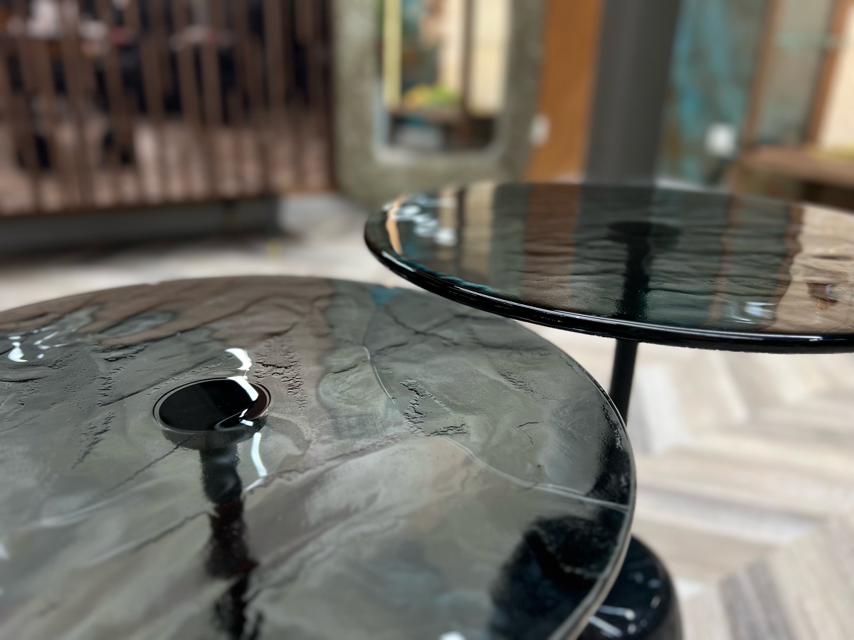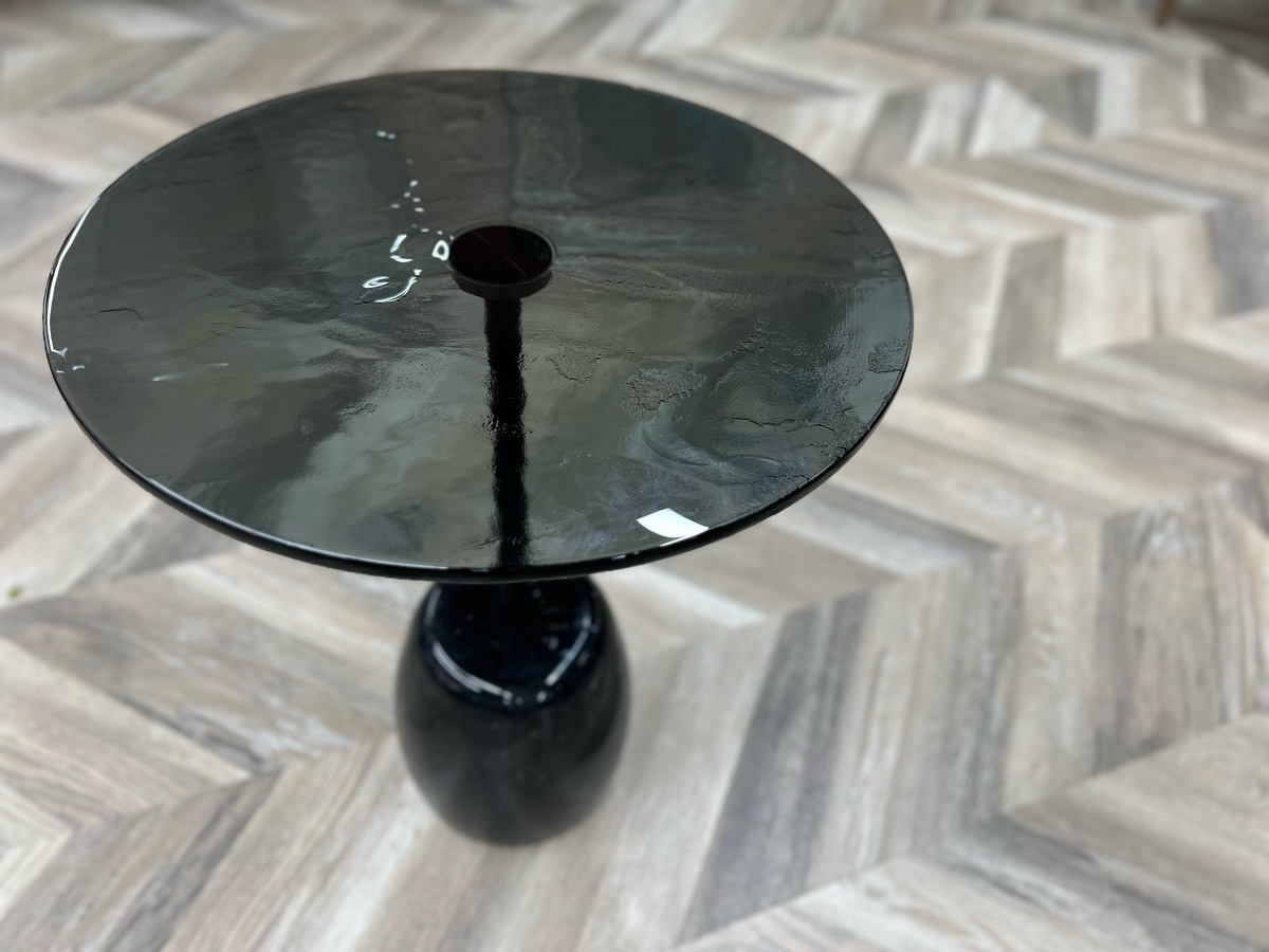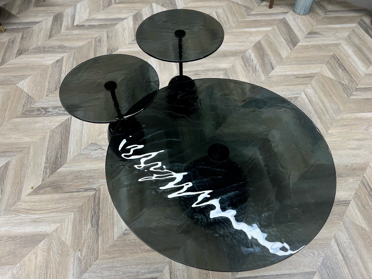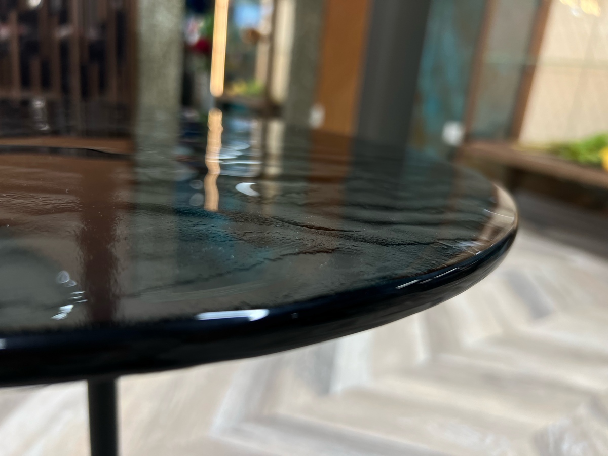 Столешница - выполнена из запеченого стекла, полученного в результате плавления. Оно создает завораживающий визуальный эффект ‘тягучего сиропа’, отражая собой детали игры всего окружающего света в пространстве.