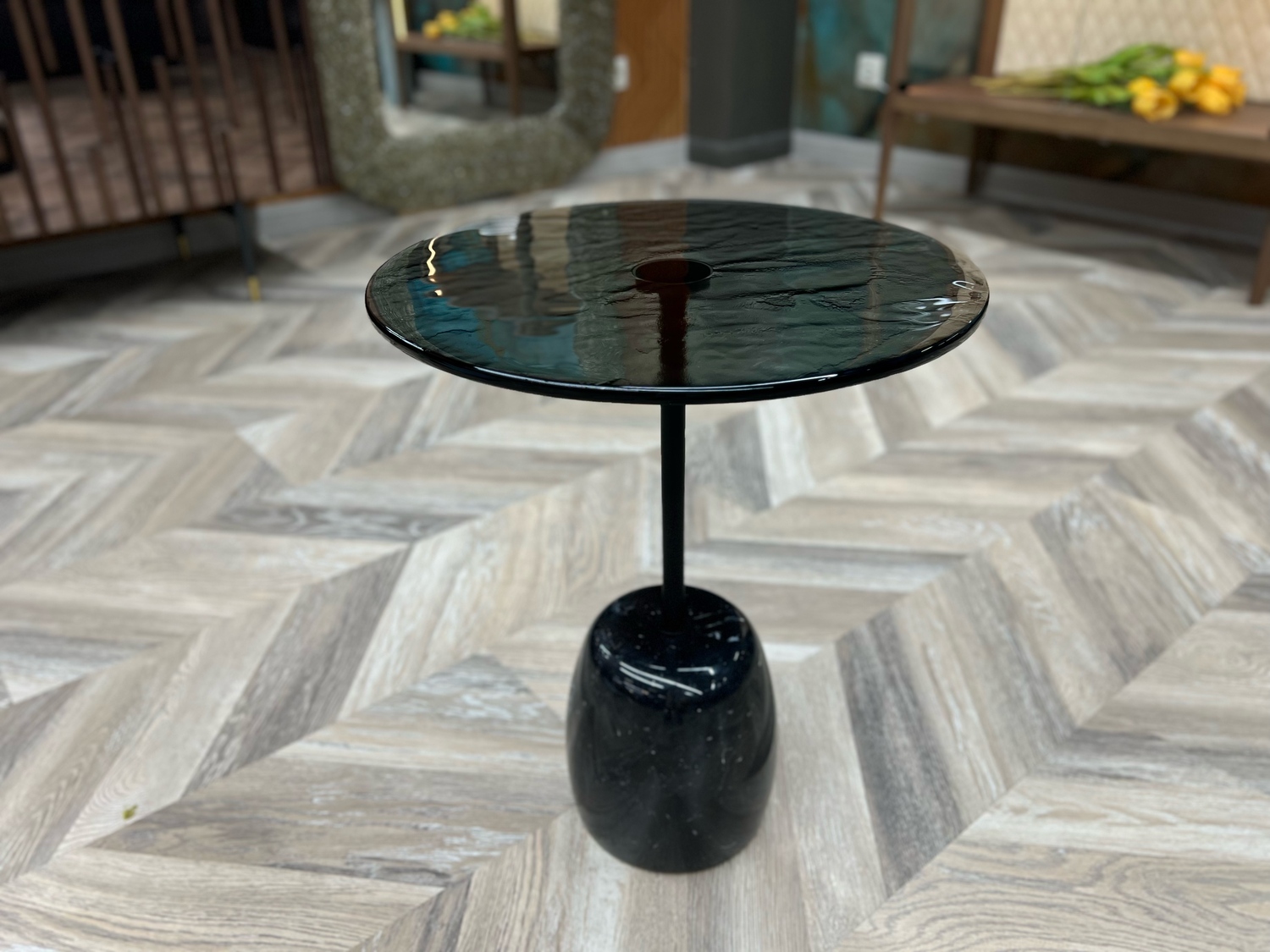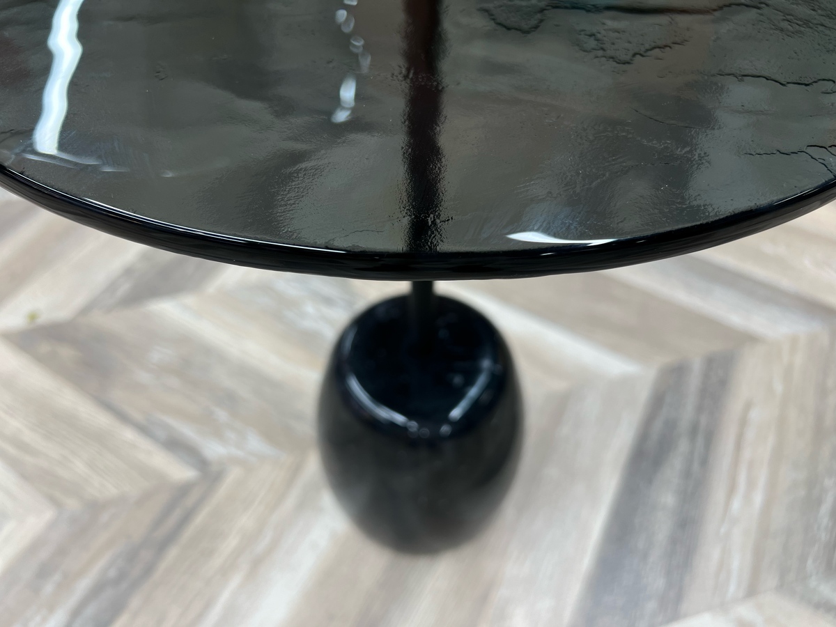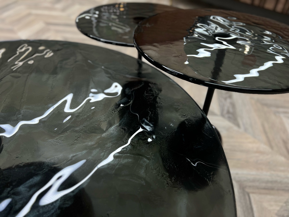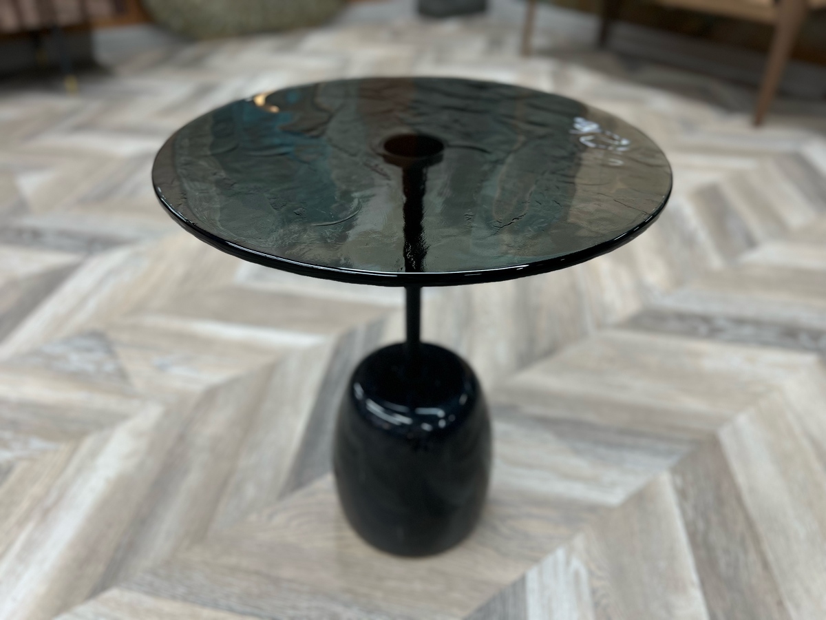 Столешница - выполнена из запеченого стекла, полученного в результате плавления. Оно создает завораживающий визуальный эффект ‘тягучего сиропа’, отражая собой детали игры всего окружающего света в пространстве.