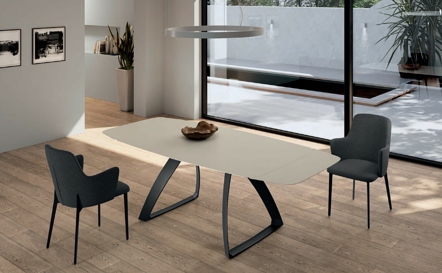 Керамическая столешница, имитирующая натуральный мрамор песочного цвета, имеет бочкообразную форму, создавая своими плавными линиями эргономичную форму стола.