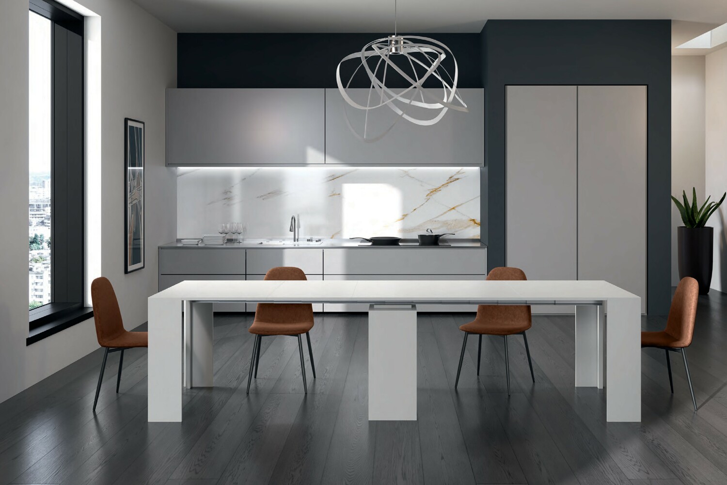 Элегантная пристенная консоль, изготовленная из МДФ и окрашенная в матовый цвет. За счет пяти вставок шириной 52 см консоль может увеличиваться в длину до 302 см, превращаясь в большой обеденный стол на 14 человек. В собранном состоянии консоль служит функциональным предметом интерьера для прихожей или гостиной. Вставки хранятся отдельно и могут использоваться в том количестве, которое необходимо для данного конкретного случая.