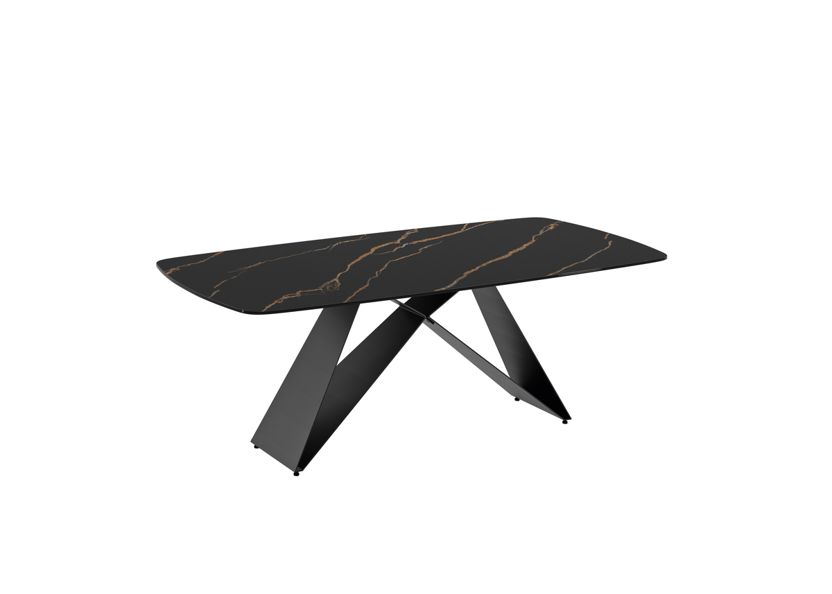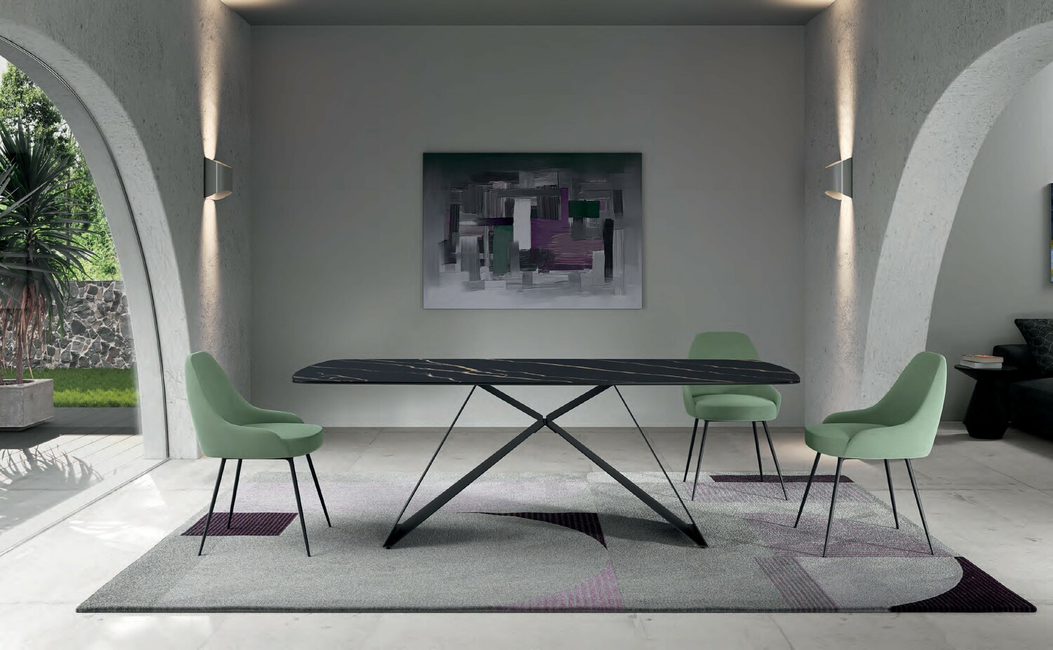 Бочкообразная керамическая столешница с имитацией натурального мрамора особо функциональна за счет скошенных углов, вписывая стол в пространство, не нарушая его единства. Металлическое основание придает столу динамизм, делая отсылку к индустриальному дизайну.