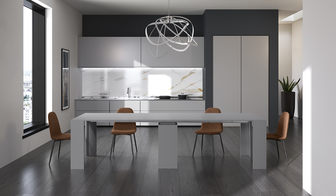 Элегантная пристенная консоль, изготовленная из МДФ и окрашенная в матовый цвет. За счет пяти вставок шириной 52 см консоль может увеличиваться в длину до 302 см, превращаясь в большой обеденный стол на 14 человек. В собранном состоянии консоль служит функциональным предметом интерьера для прихожей или гостиной. Вставки хранятся отдельно и могут использоваться в том количестве, которое необходимо для данного конкретного случая.