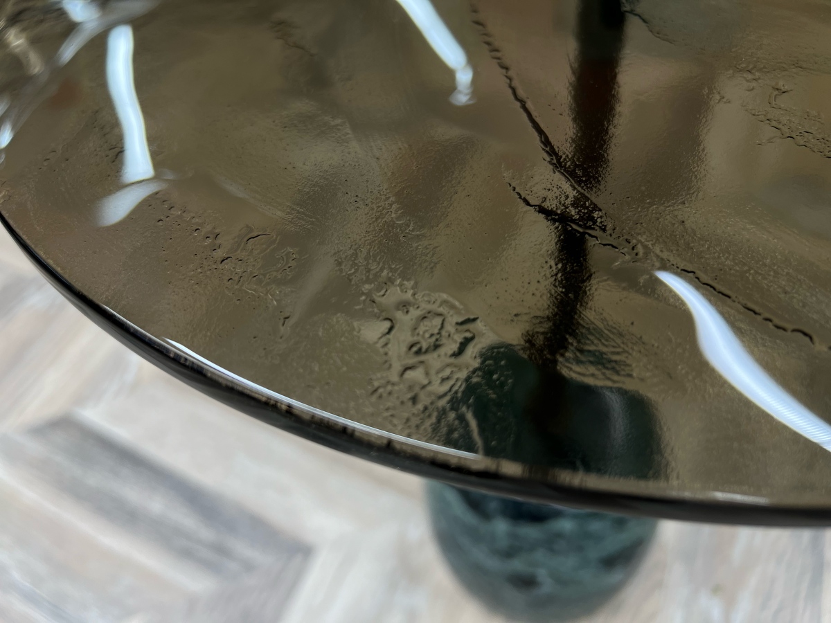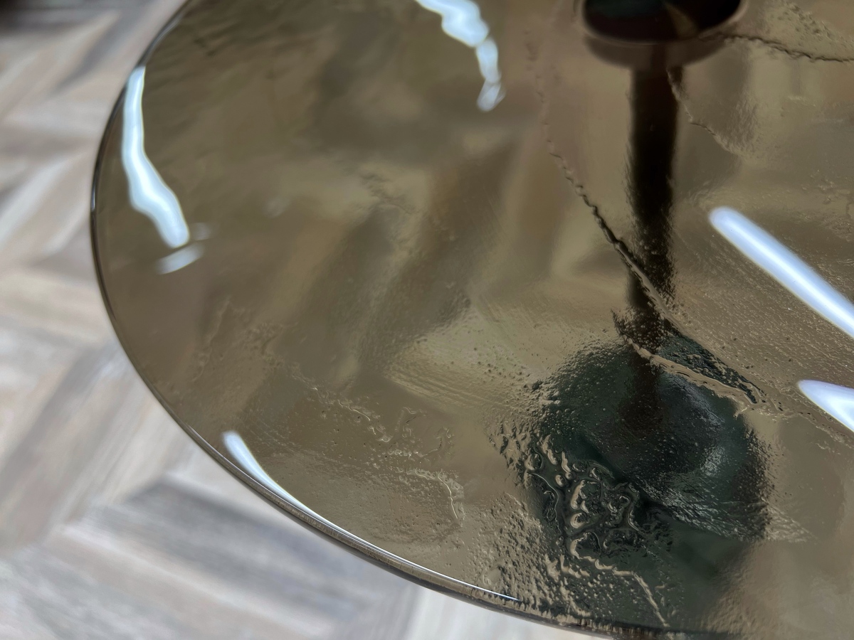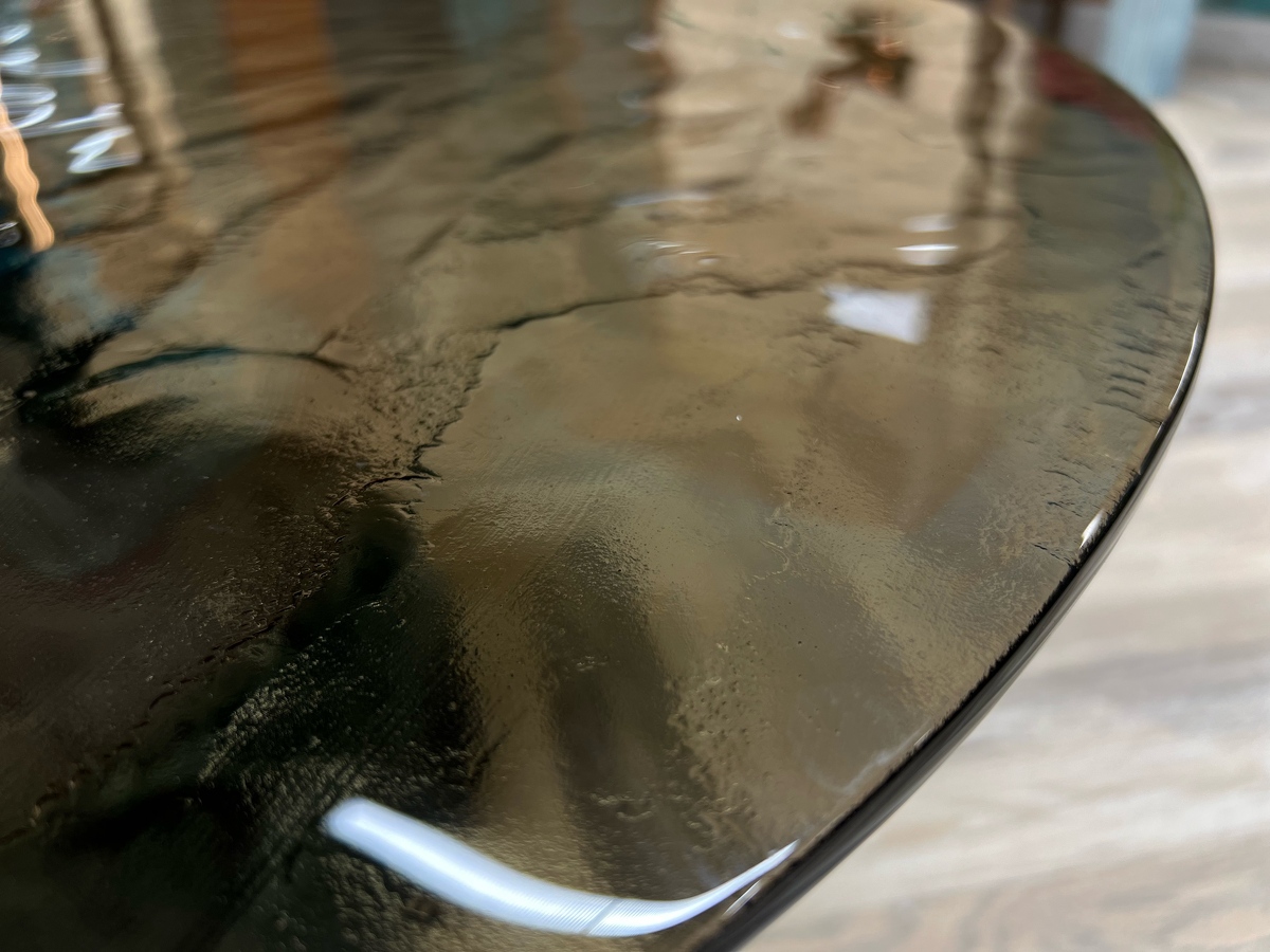 Столешница - выполнена из запеченого стекла, полученного в результате плавления. Оно создает завораживающий визуальный эффект ‘тягучего сиропа’, отражая собой детали игры всего окружающего света в пространстве.