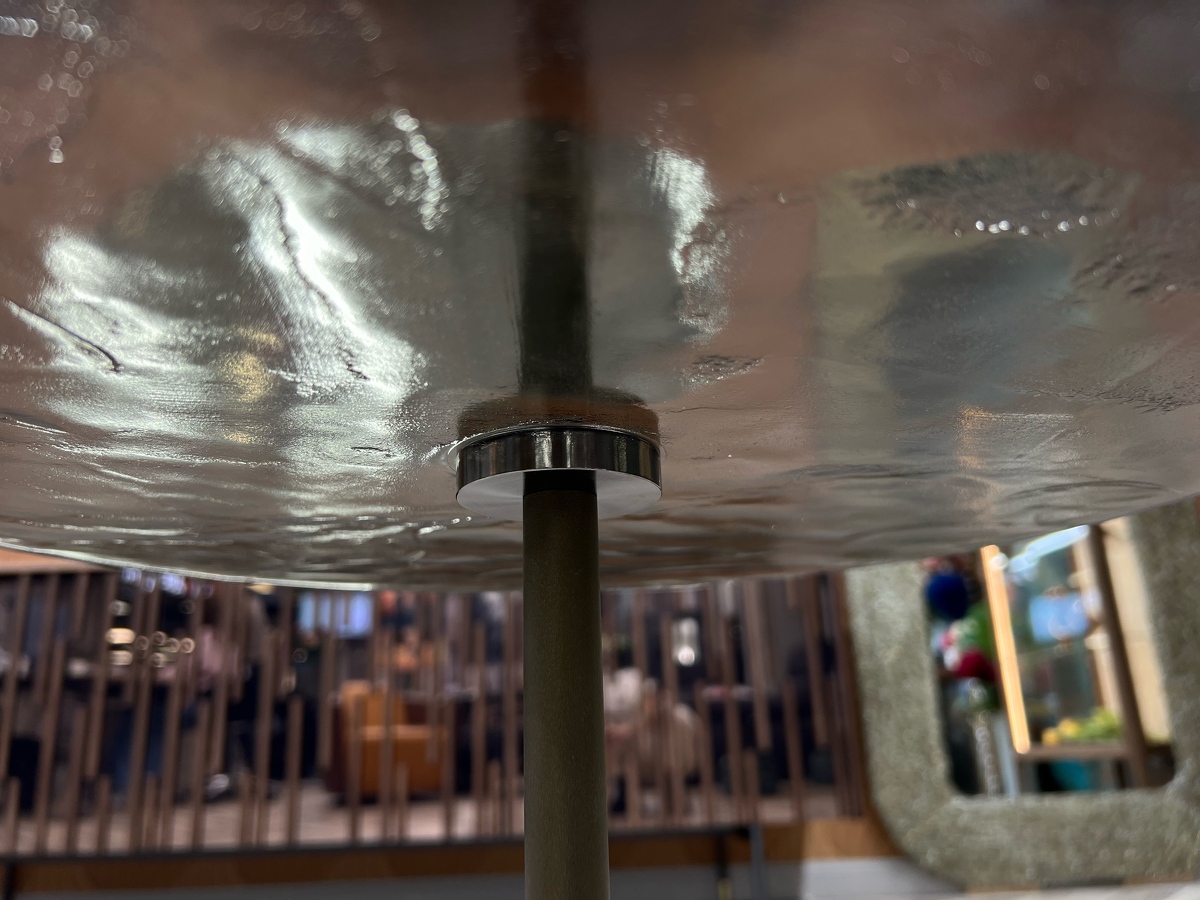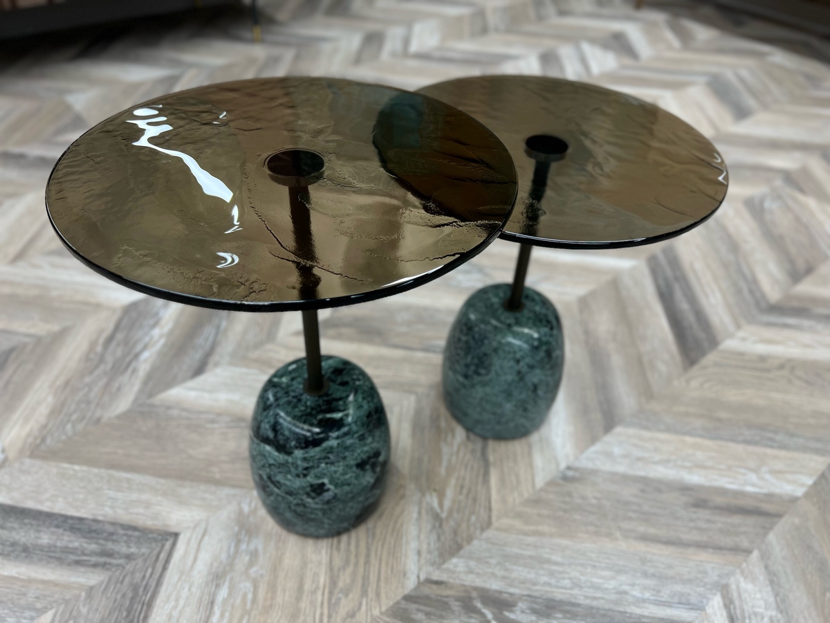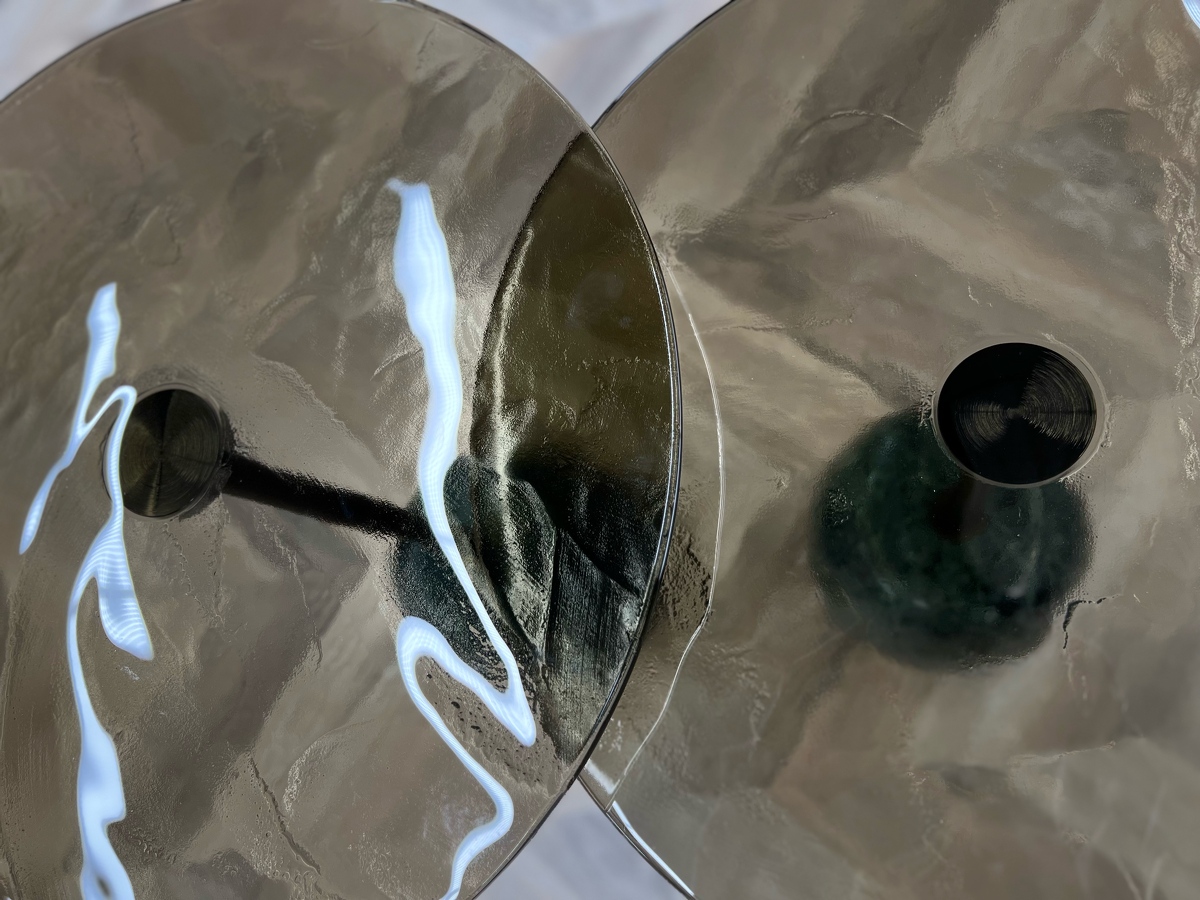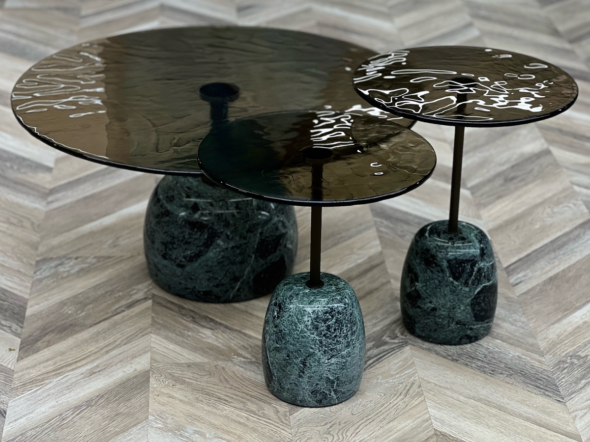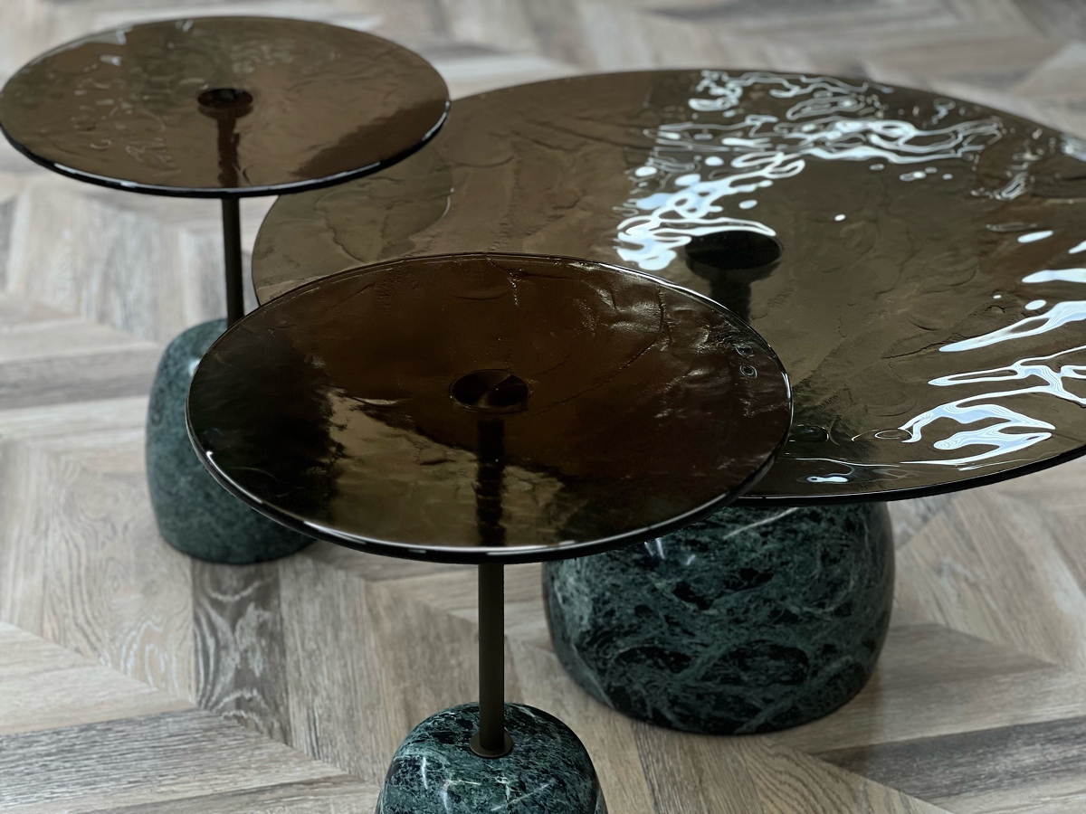 Столешница - выполнена из запеченого стекла, полученного в результате плавления. Оно создает завораживающий визуальный эффект ‘тягучего сиропа’, отражая собой детали игры всего окружающего света в пространстве.